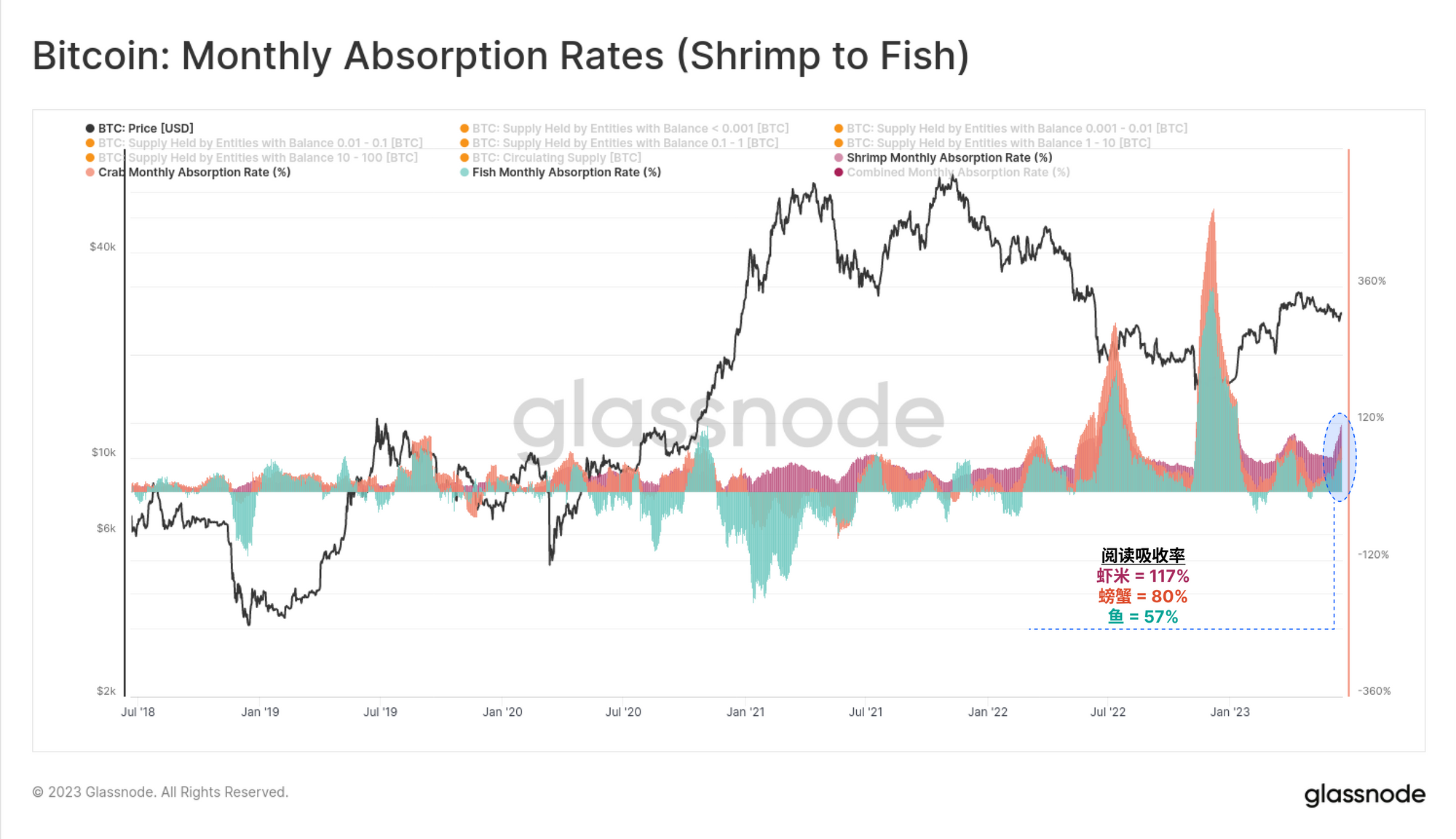 通过这种相对度量,我们发现,持有100枚 BTC以下的实体正在显著增加他们的持仓,在过去一个月内吸收了相当于矿工供应的254%(即每日产出900枚BTC的2.54倍,约等于每天2286 枚BTC)。