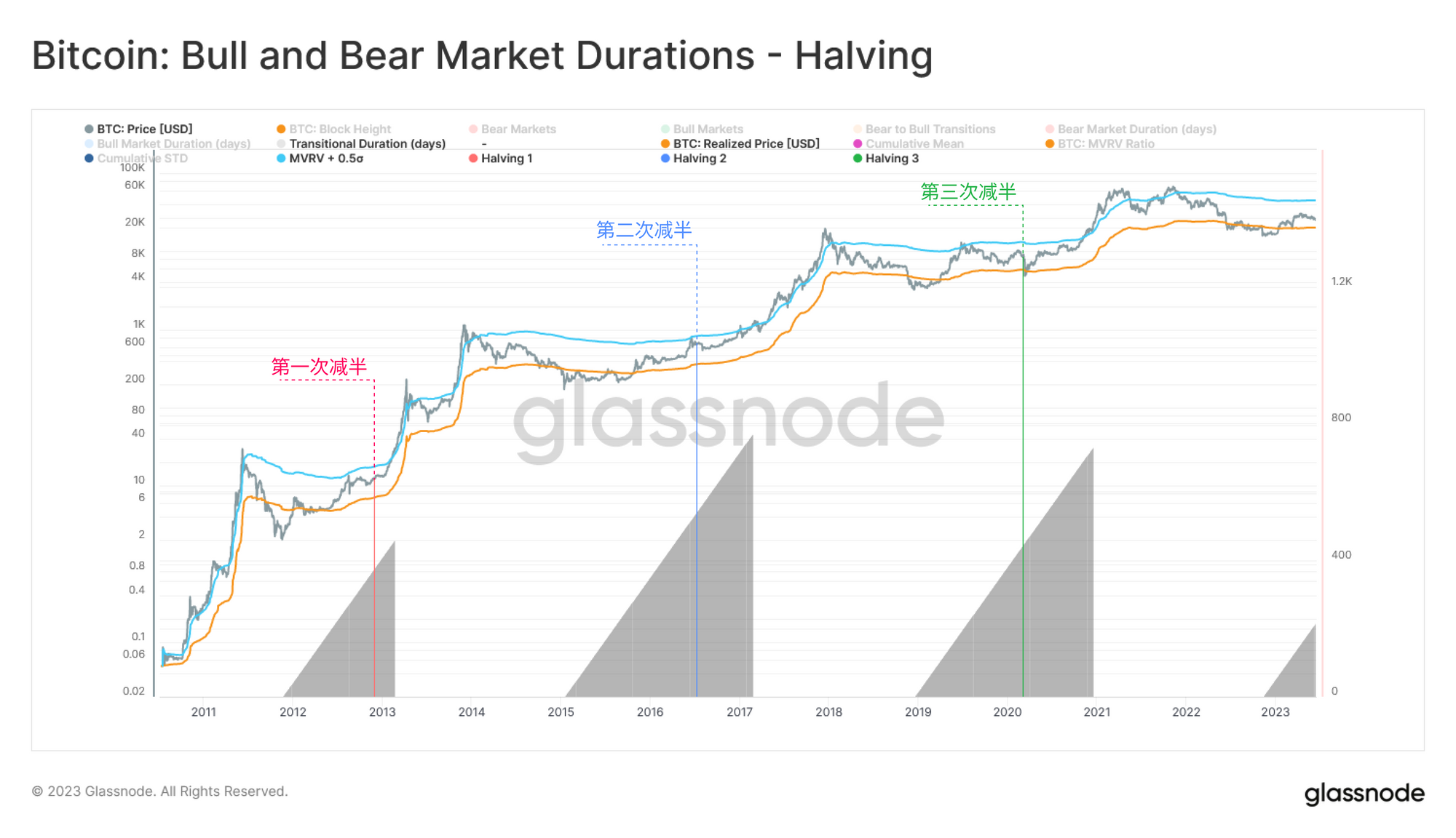 随着比特币减半仅剩305天,我们可以观察到这些过渡期和减半事件之间的关联,这些事件通常在周期的三分之二处左右发生。