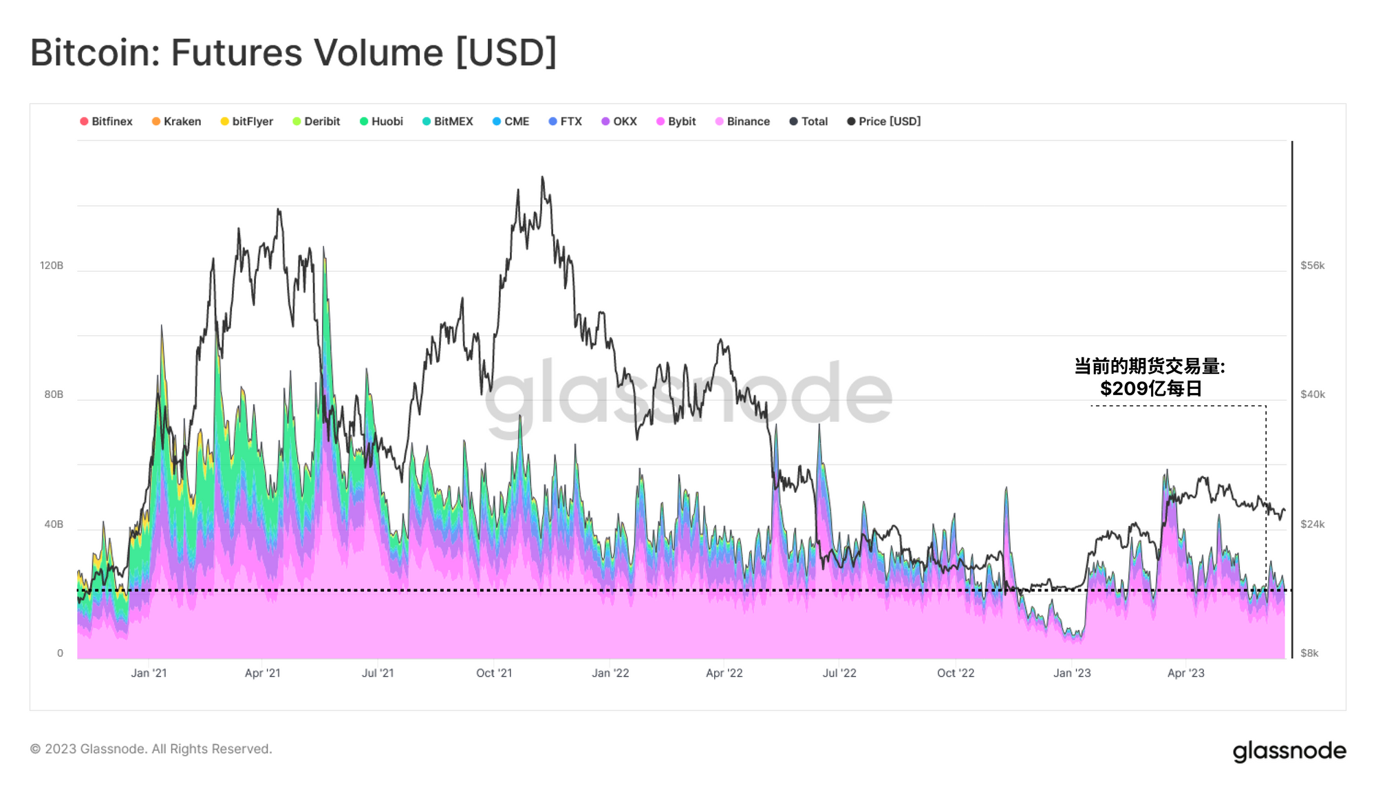 随着数字资产市场的流动性继续流失,期货市场的交易量也下降至每日209亿美元。