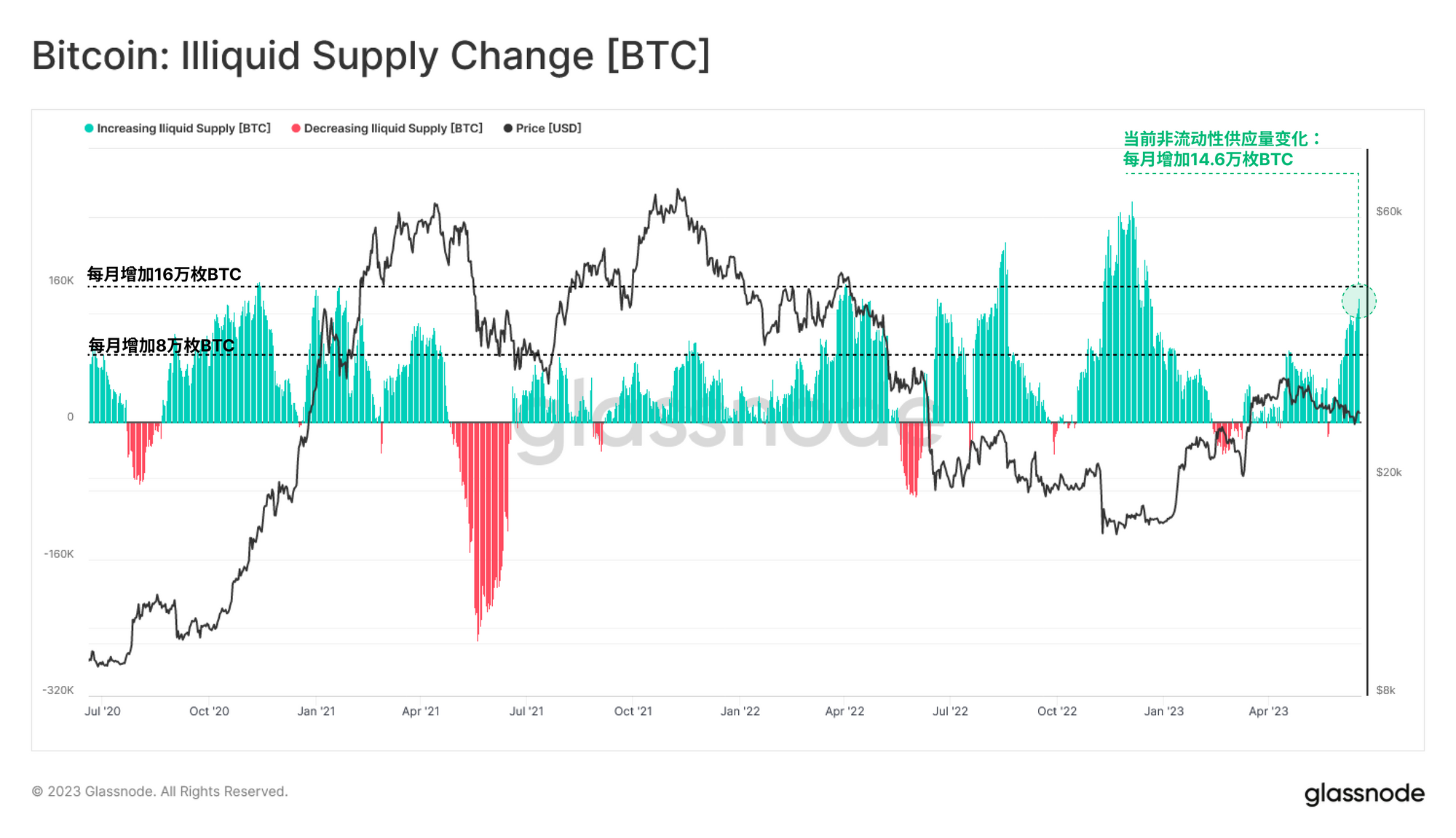 目前每月约有14.6万枚BTC流入这些不流动的钱包,支持逐渐而稳定的积累的情况。