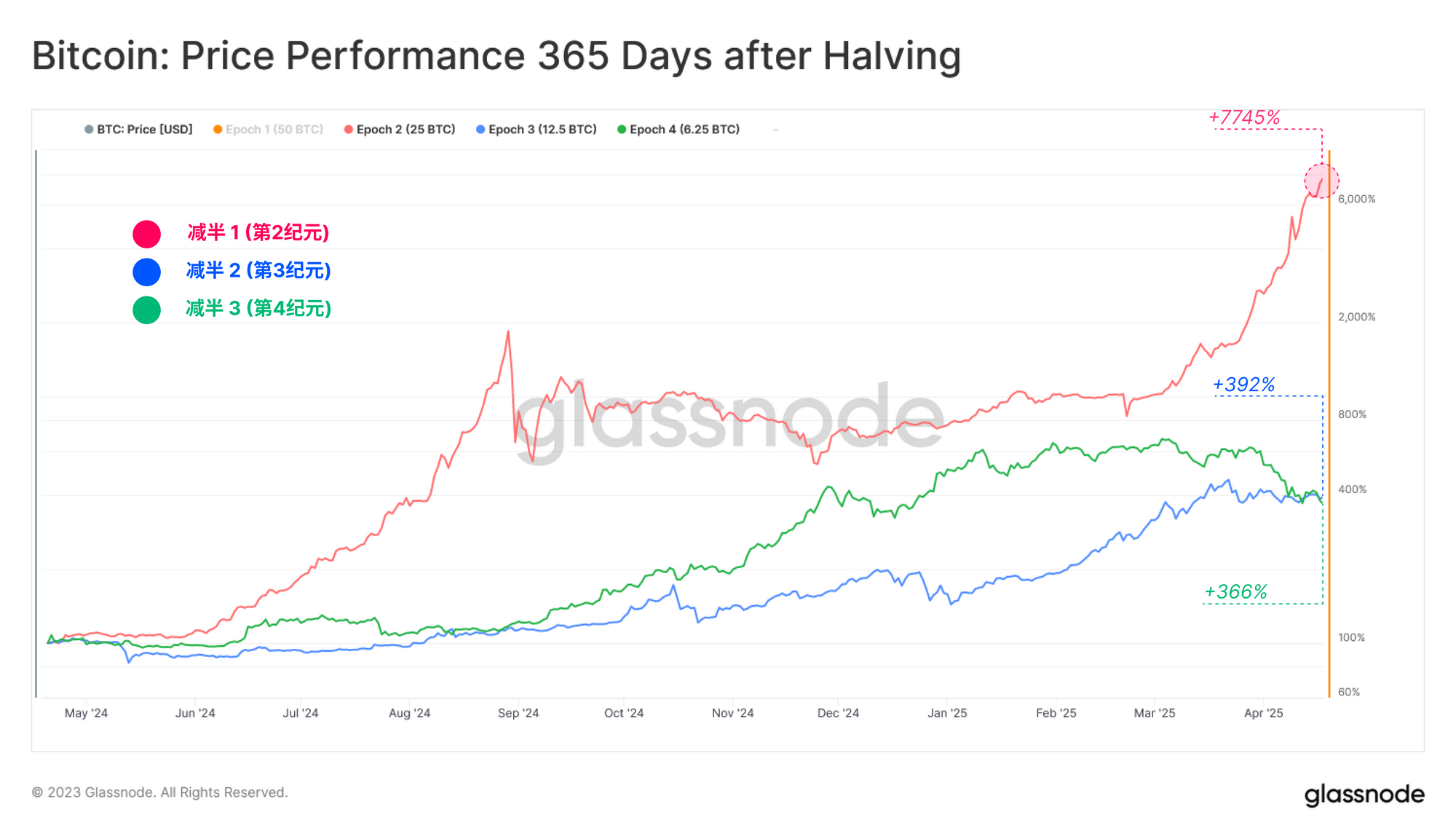 最后,我们通过评估每次减半事件后一年的价格表现来总结我们的分析: