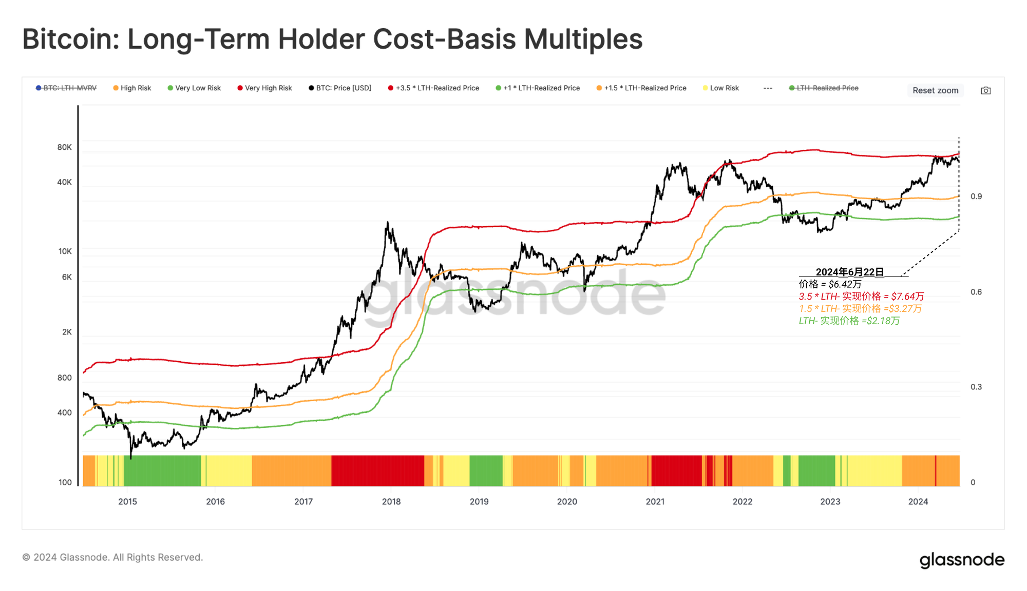 下图将现货价格与应用于LTH群体平均成本基础(LTH实现价格)的显著倍数进行了比较。