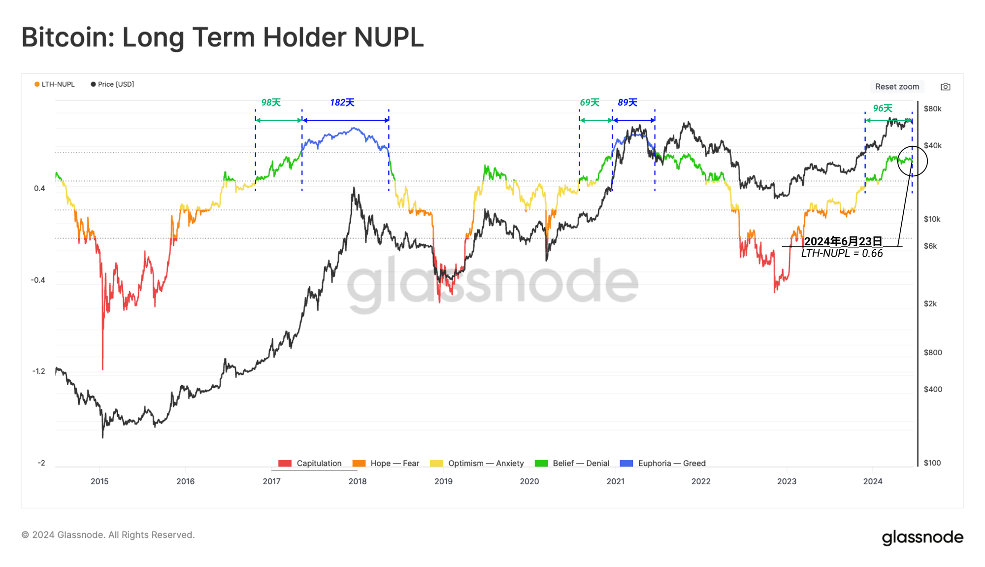 在撰写本文时,LTH-NUPL为0.66,处于与狂热前阶段🟢相关的水平之间。这种情况已经持续了96天,与2016-17周期的持续时间非常相似。