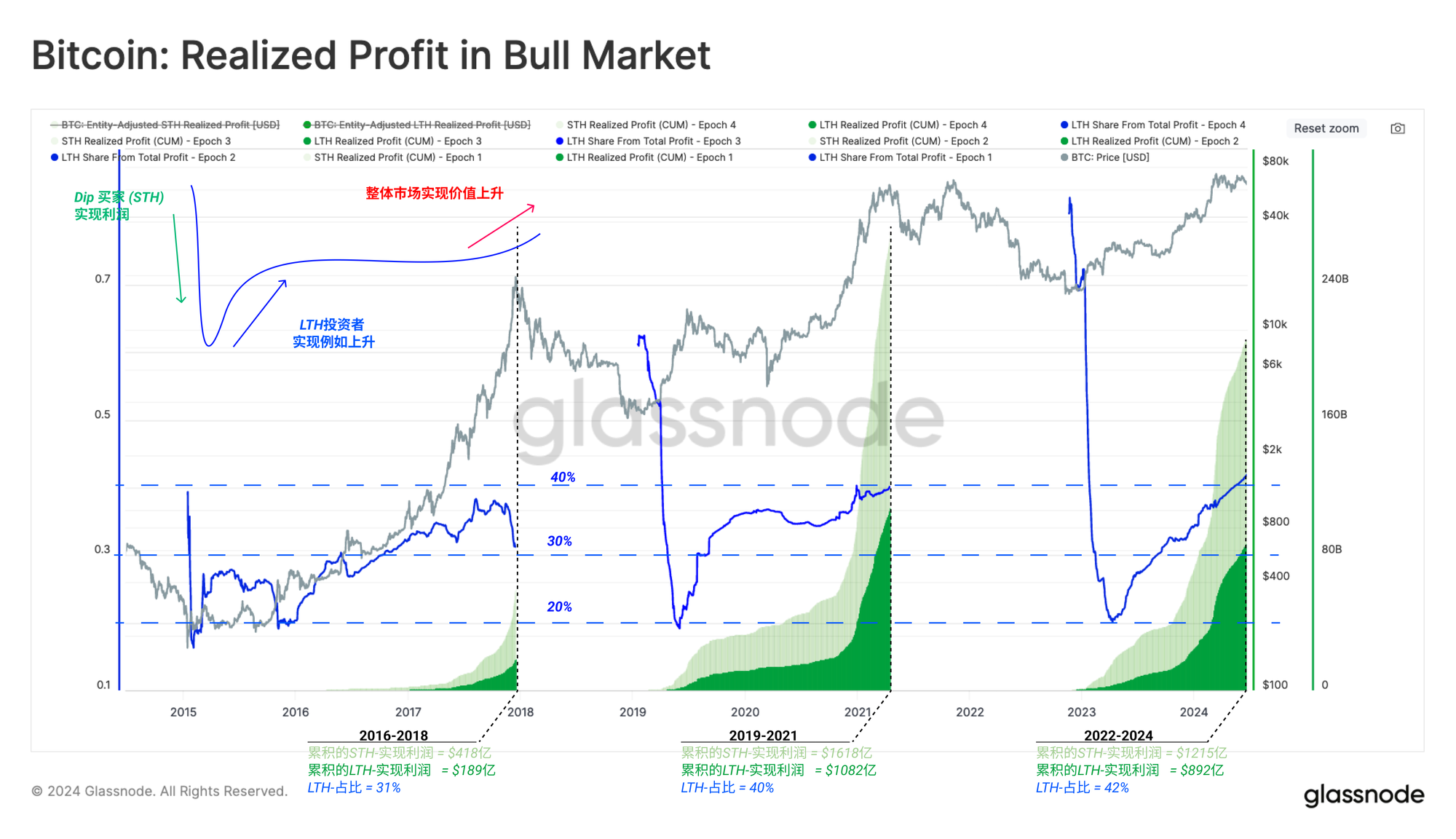 下图捕捉了长期持有者在牛市期间锁定的累计实现利润量。我们发现,LTH通常占总锁定利润的20%到40%。
