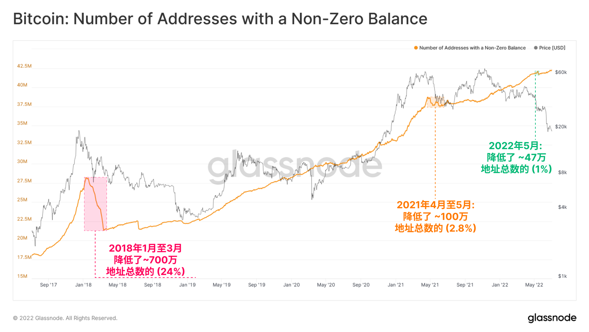 - 2022年5月 43万个地址消失,总量减少了1%,尽管币价跌幅巨大,但明显没有4-5月21日那么严重。
