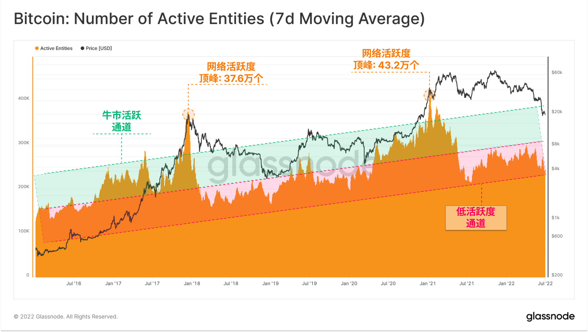活跃实体在2021年11月历史前高之后确实经历了一次明显的上涨,因为参与者猜测价格会进一步上涨。然而,这种期望后来消散了,现在参与者已经普遍持有币价下降趋势的看法。每天大约有24.4万个活跃实体,在熊市典型的低活动通道的下端徘徊(红色部分)。
