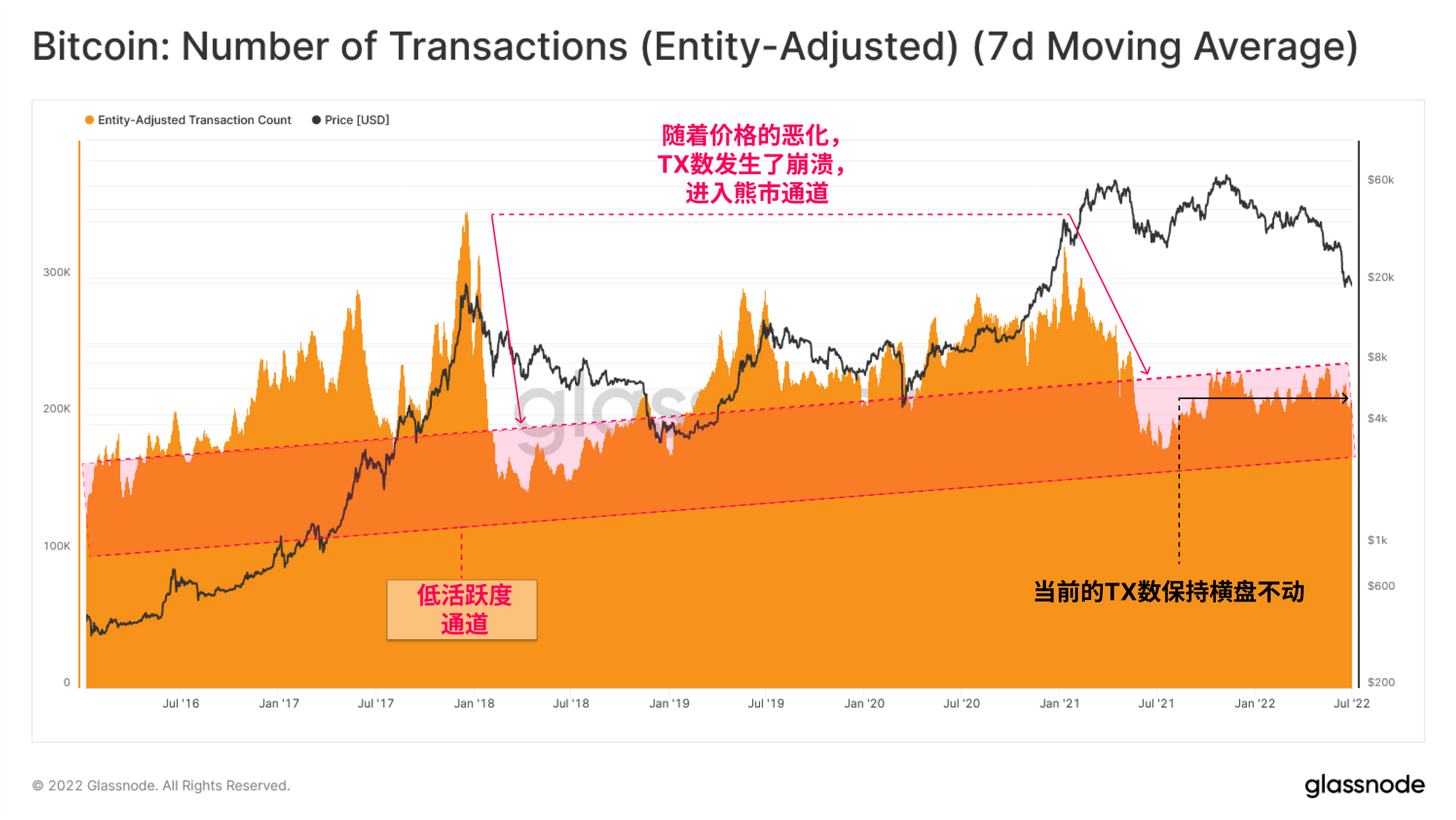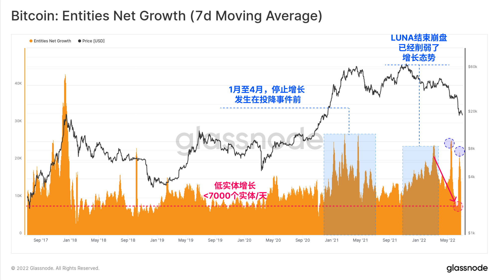 可以通过实体净增长的崩溃清楚地观察到市场参与者的投降,这个指标展示了链上新实体和离开实体之间的差异。除了在 LUNA崩溃期间,以及6月下旬抛售的两个高峰,整体增长率缺乏活力。