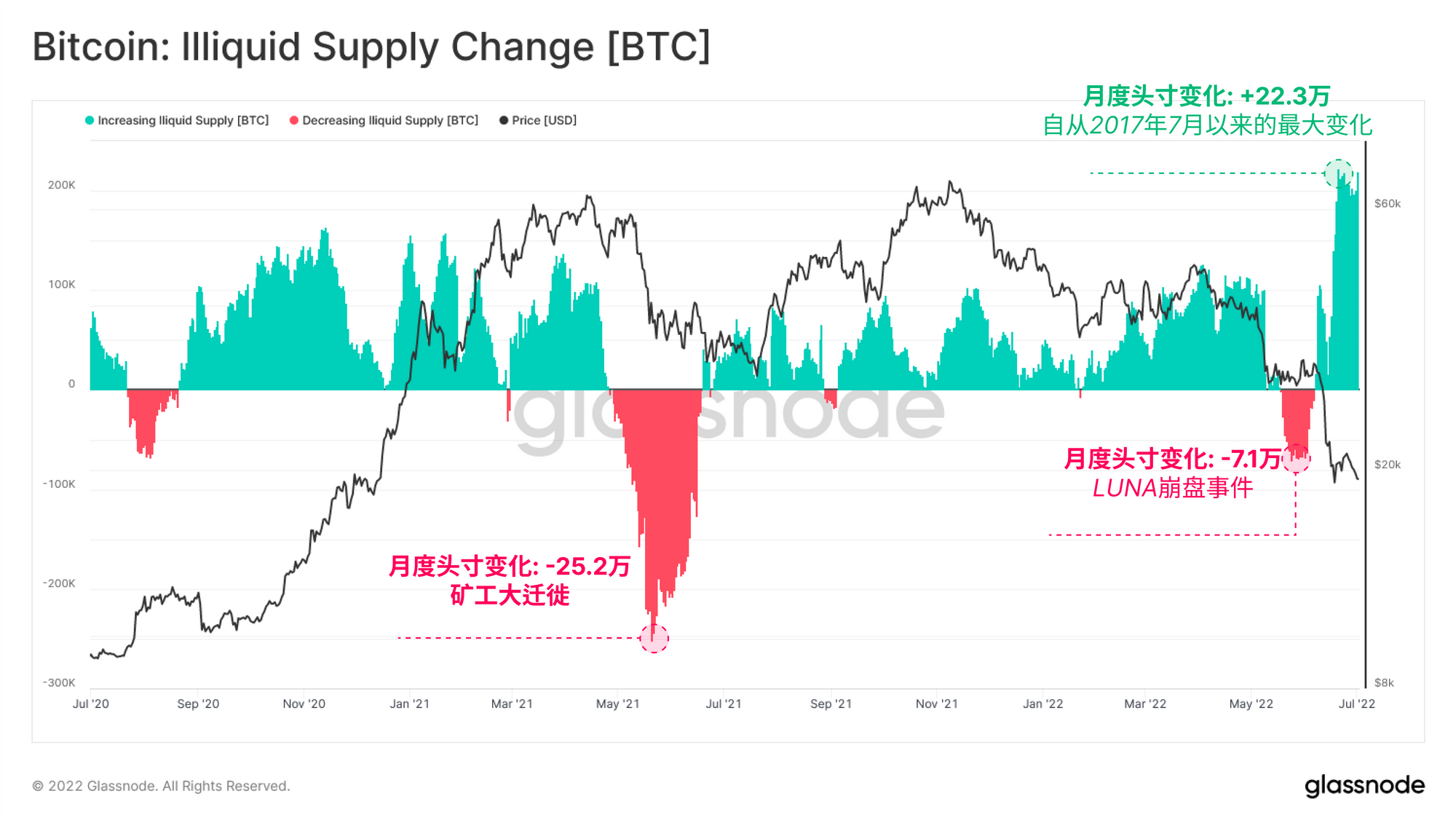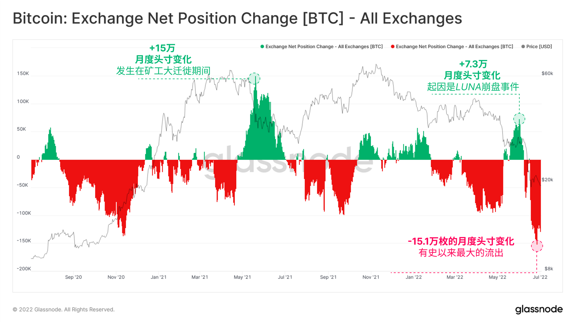 伴随着历史上糟糕的比特币价格表现,交易所余额出现了有史以来最大的月度下降,达到了15万枚比特币/月的流出率。整个6月份的流出量占了交易所余额减少总量的5.0%至6.0%。这与2021年5月至6月发生的比特币涌入交易所的情况形成了鲜明的对比。