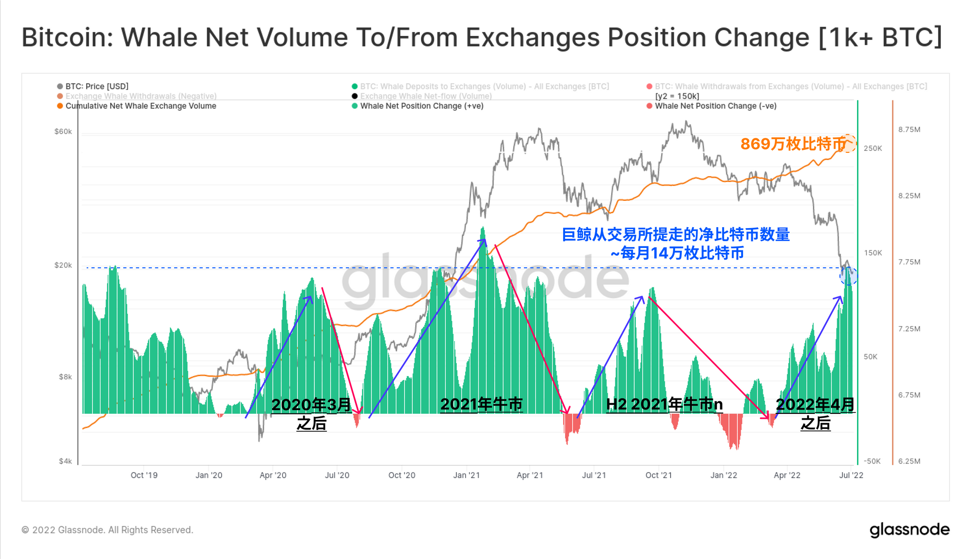 总的来说,鲸鱼已经从我们追踪的交易所提取了869万枚比特币,他们的积累和卖出周期似乎与市场价格有着很好的相关性。自2022年4月以来,鲸鱼交易所的交易量一直以提币为主,在6月达到了14万枚比特币/月的比率。这是过去5年中的第二高比率,仅次于2021年1月的修正。