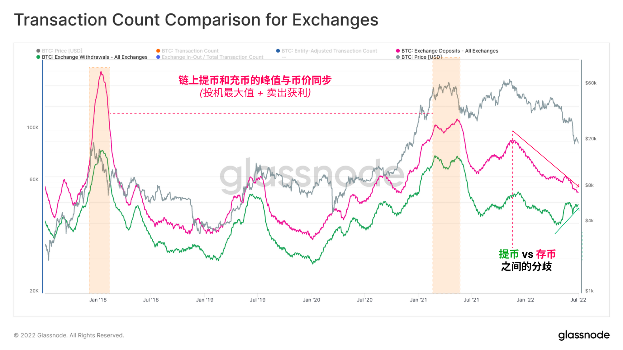 最近几周,人们重新关注区块链资产的自我保管,一些借贷机构停止了用户存入和提币服务。也许是为了应对这种不幸的情况,我们目前发现交易所的提币量在增加,而存入数量继续下降。