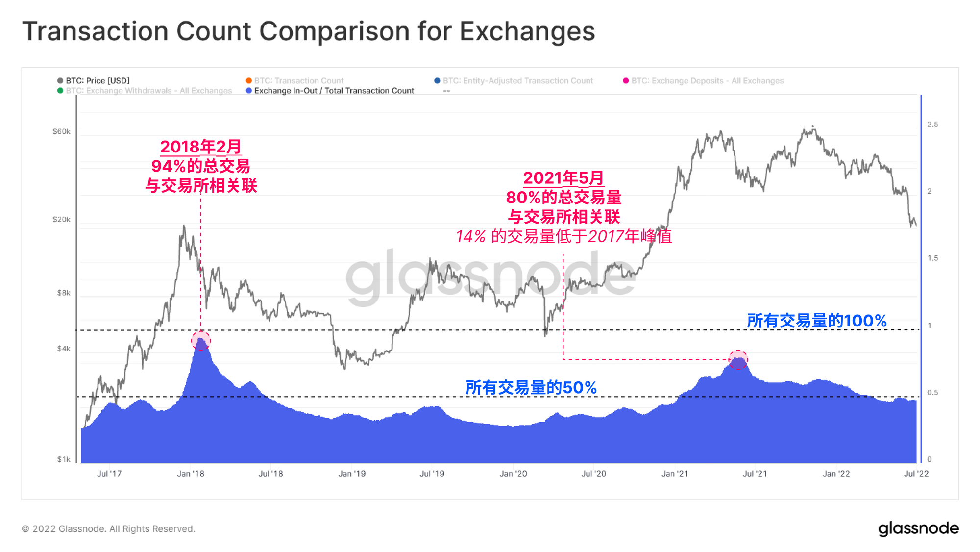 我们还可以评估交易所相关活动在整个网络所有交易中的主导地位。由此,我们可以识别投资者活动的高峰和低谷,并确定基数市场结构的变化。