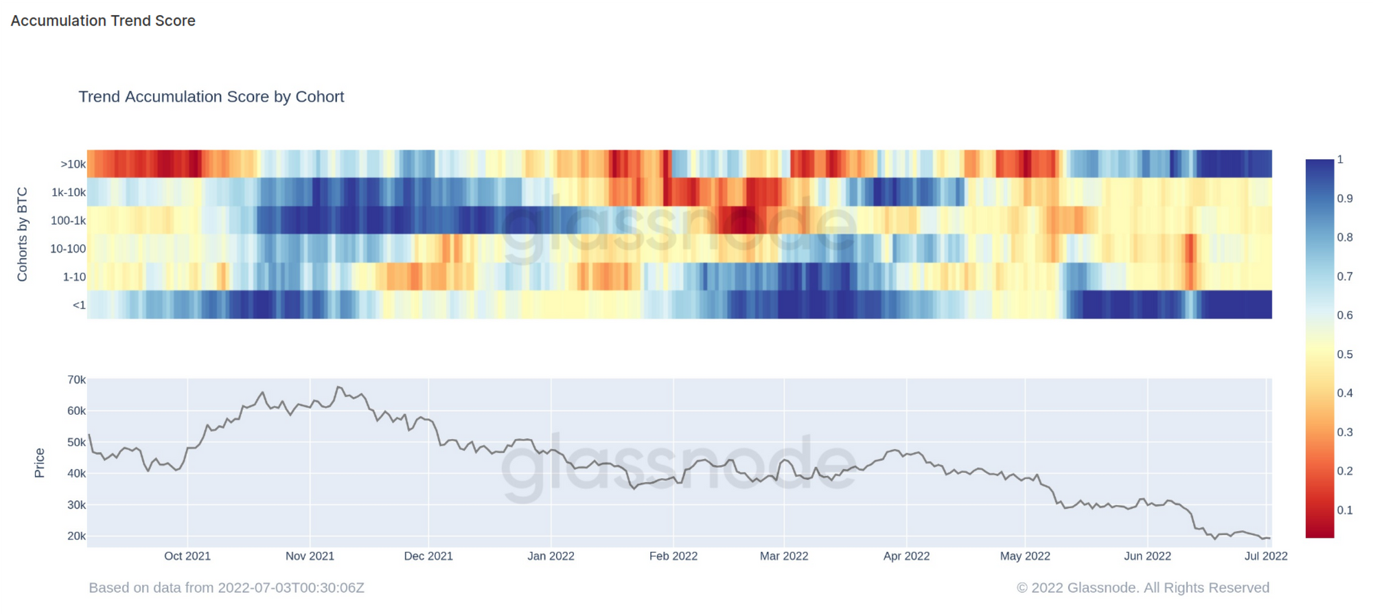 随着交易所余额的不断耗尽,我们观察到最大的(拥有1万枚+ BTC)和最小的(拥有1枚比特币以下的)比特币参与者都在积极地积累。自5月中旬以来,"虾米 "和 "巨鲸 "在 "趋势积累得分 "指标上的得分都接近满分(蓝色),表明他们的链上余额已经出现有意义地增加,而且持续地增加。
