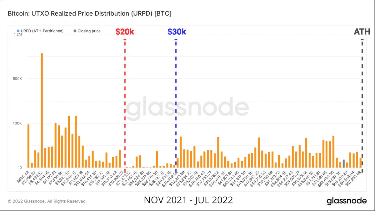 在目前的2022年市场中,在2021年11月的历史前高之后,到目前为止我们有一个类似的结构。我们可以看到类似的重新分配模式发生在3万美元的底线周围,最初建立于2021年5月至7月。在今年5-6月的过程中,我们可以看到价格交易下降到2万美元的区域,这成为投资者投降和新买家的重要触发点,因此成为比特币转手的节点。