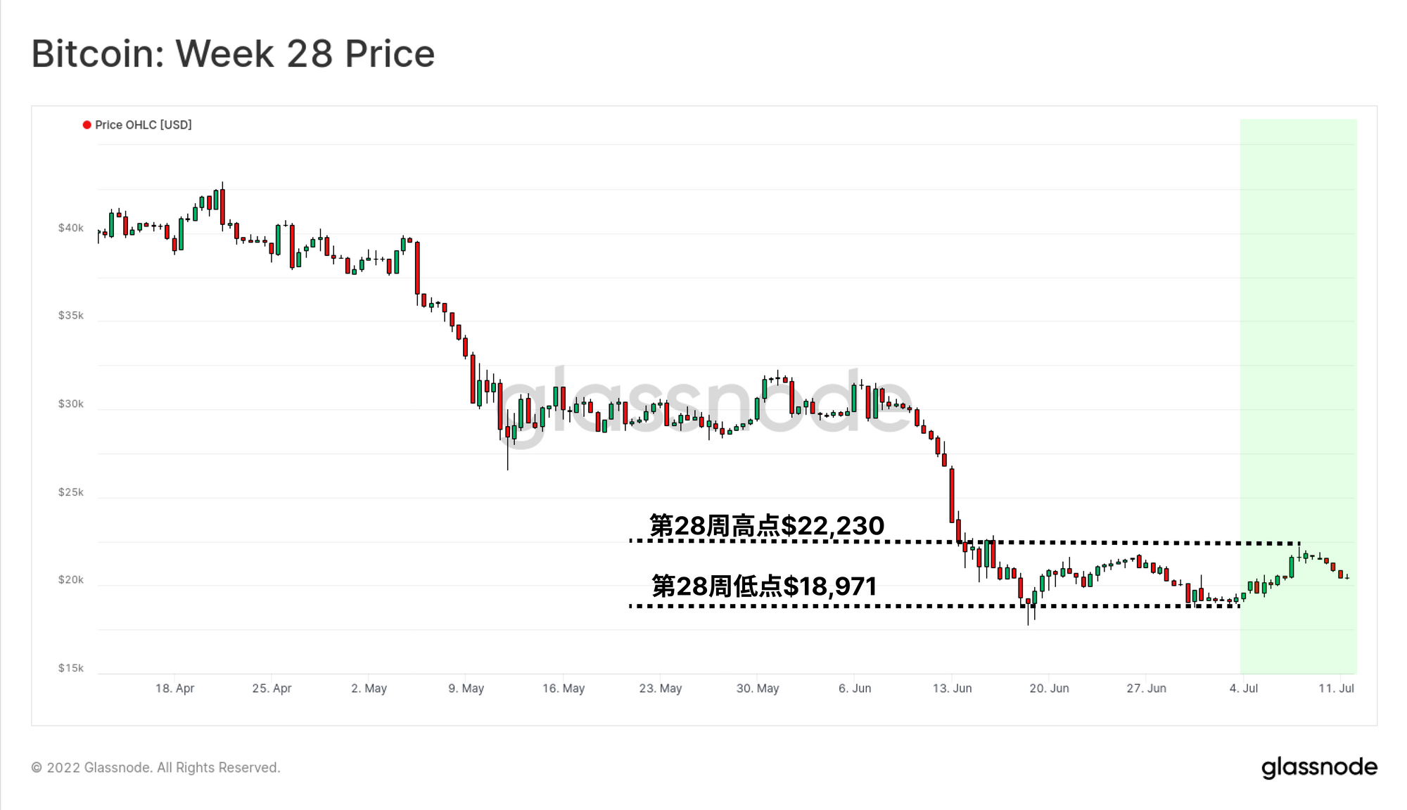本周比特币价格继续在2万美元范围内盘整,因为市场在消化6月份的极端下行波动。价格交易走高,以18971美元的周低点开盘,并在22230美元达到峰值。