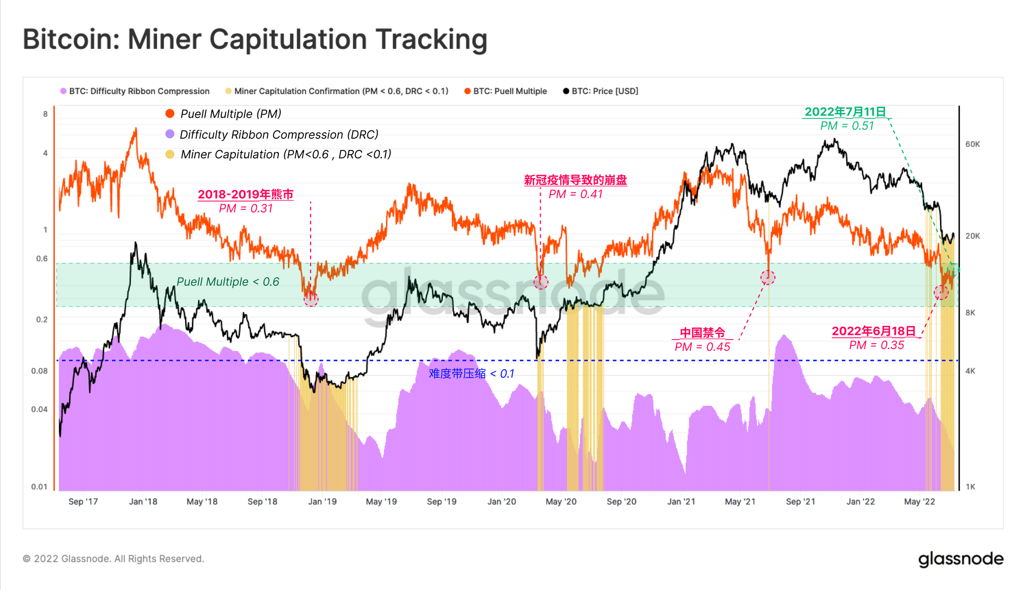 为了跟踪 矿工投降是否发生,我们可以参考一个两部分的模型,寻求隐含收入压力(Puell Multiple)和可观察到的总算力下降(难度带压缩)之间的汇合。