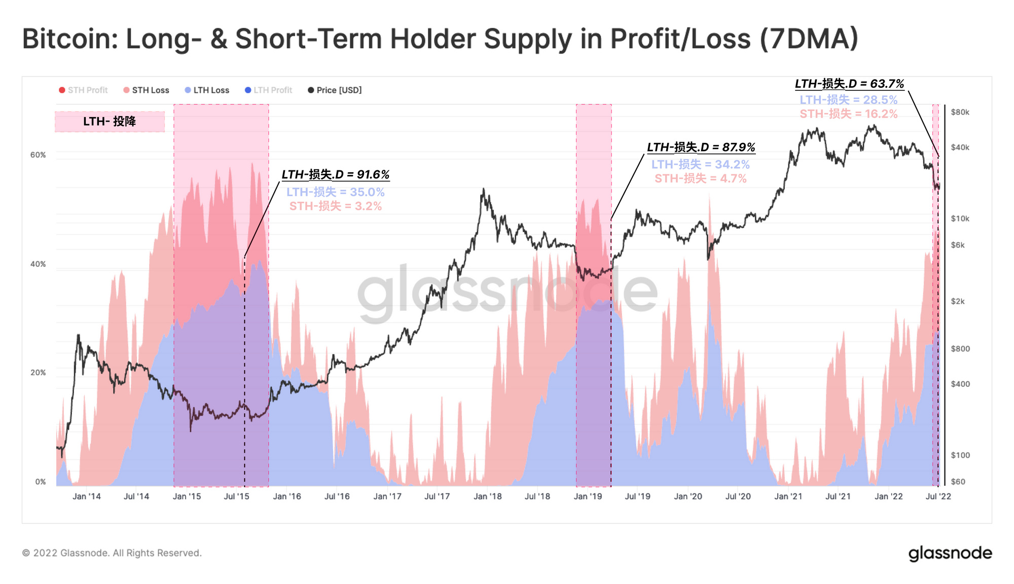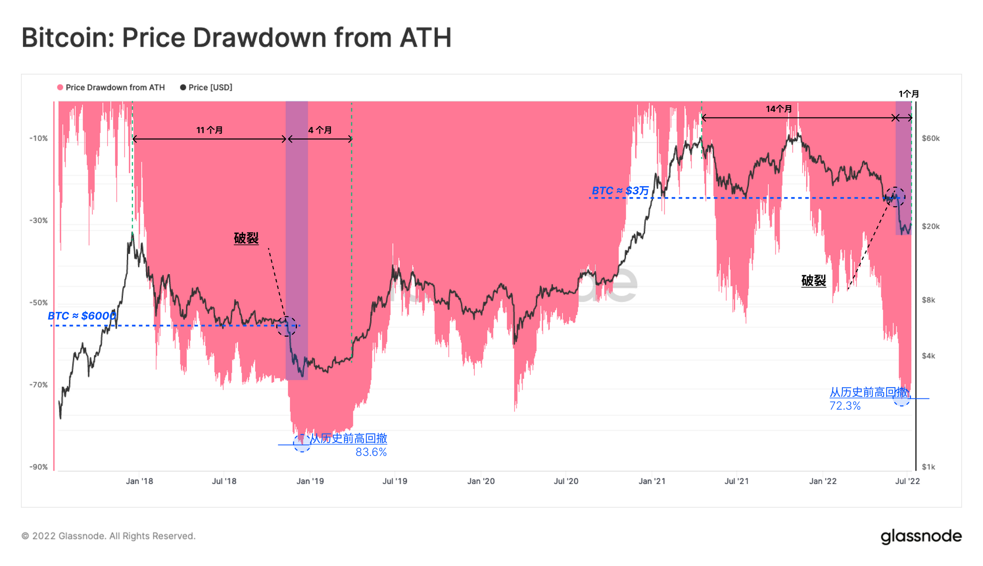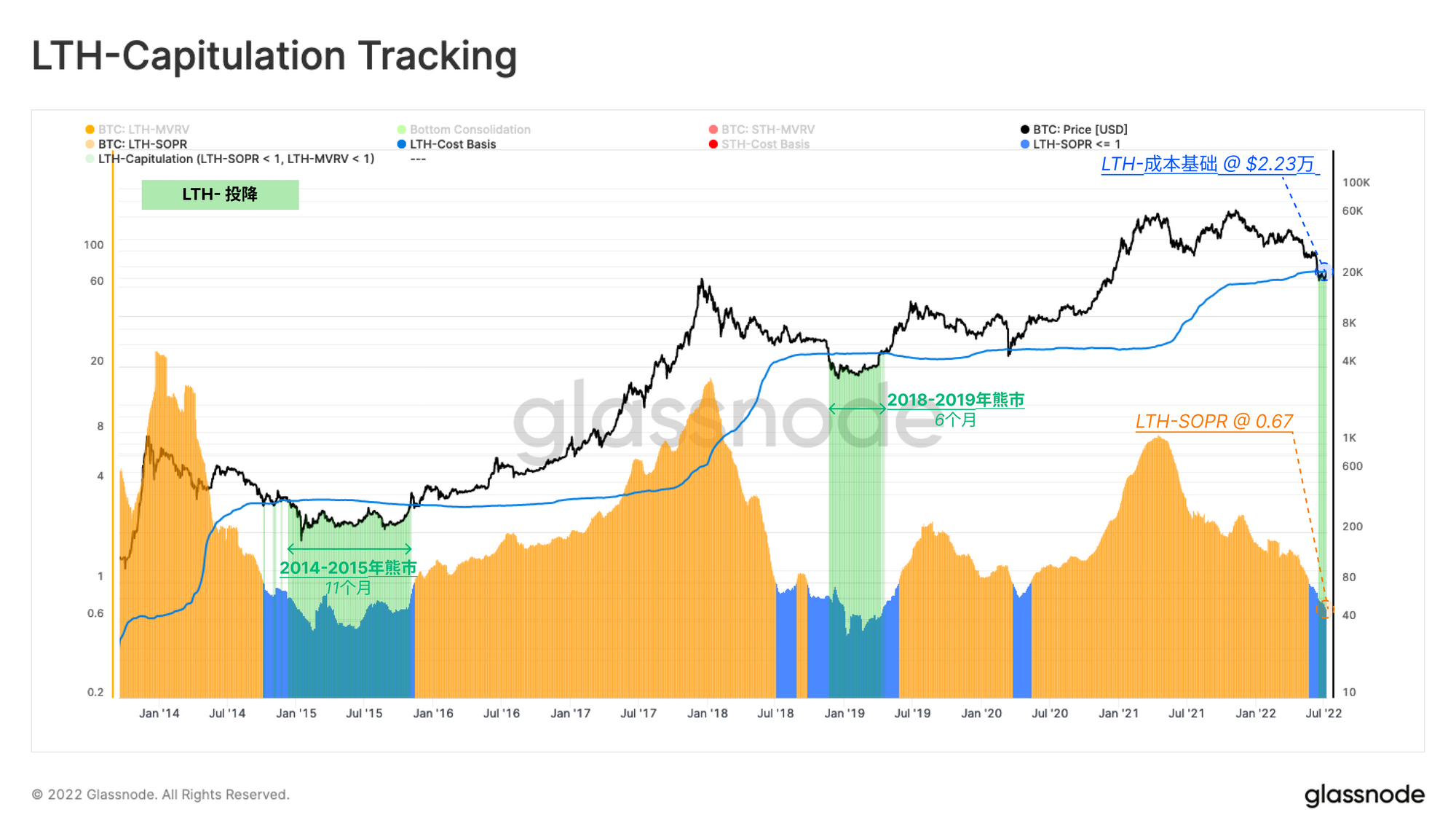 • 2021年11月-2022年7月:目前的熊市已经从前高位置回撤了75%,2.9万美元的底线也是类似的突破点基础水平。在6月中旬的投降中,价格在短短两周内跌至17600美元,跌幅为40%。