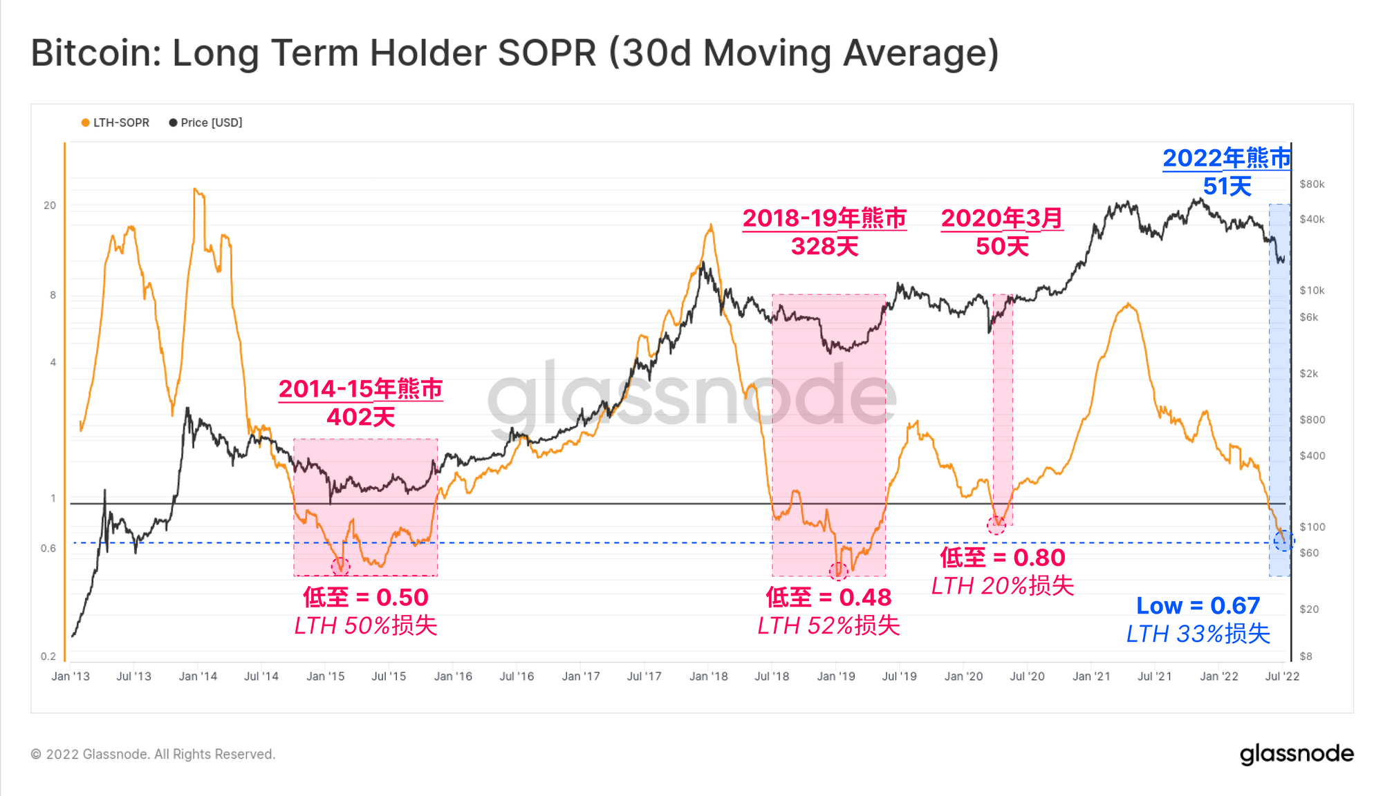 长期持有者卖出产出利润率(LTH-SOPR)是一个展示长期持有者所获得的利润率的指标,(例如:2.0的值意味着长期持有者以2倍于其成本基础的价格卖出比特币)。因此,当LTH-SOPR的值小于1时,这些玩家低于其成本基础的价格割肉卖出比特币,实现了损失。