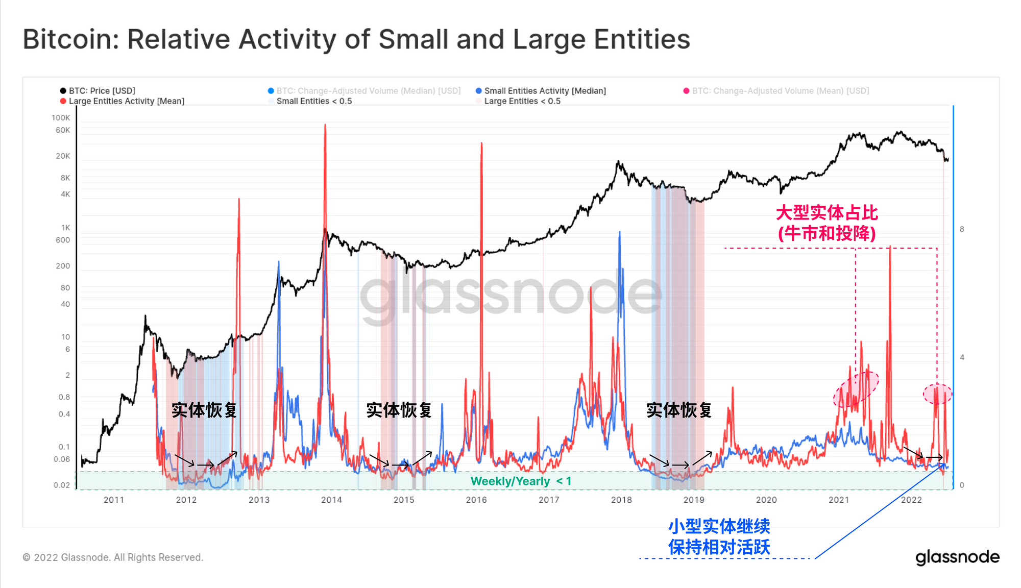 亏损的供应量现在已经达到44.7%,其中大部分是由长期持有者群体承担。然而,与以前的熊市周期相比,这仍然是一个不太严重的水平。我们还引入了一个新的指标,跟踪小型和大型实体的活动水平,作为映射市场复苏的工具。这支持了市场已经进入熊市的观察,然而还没有形成一个自信的底部,仍有工作要做。