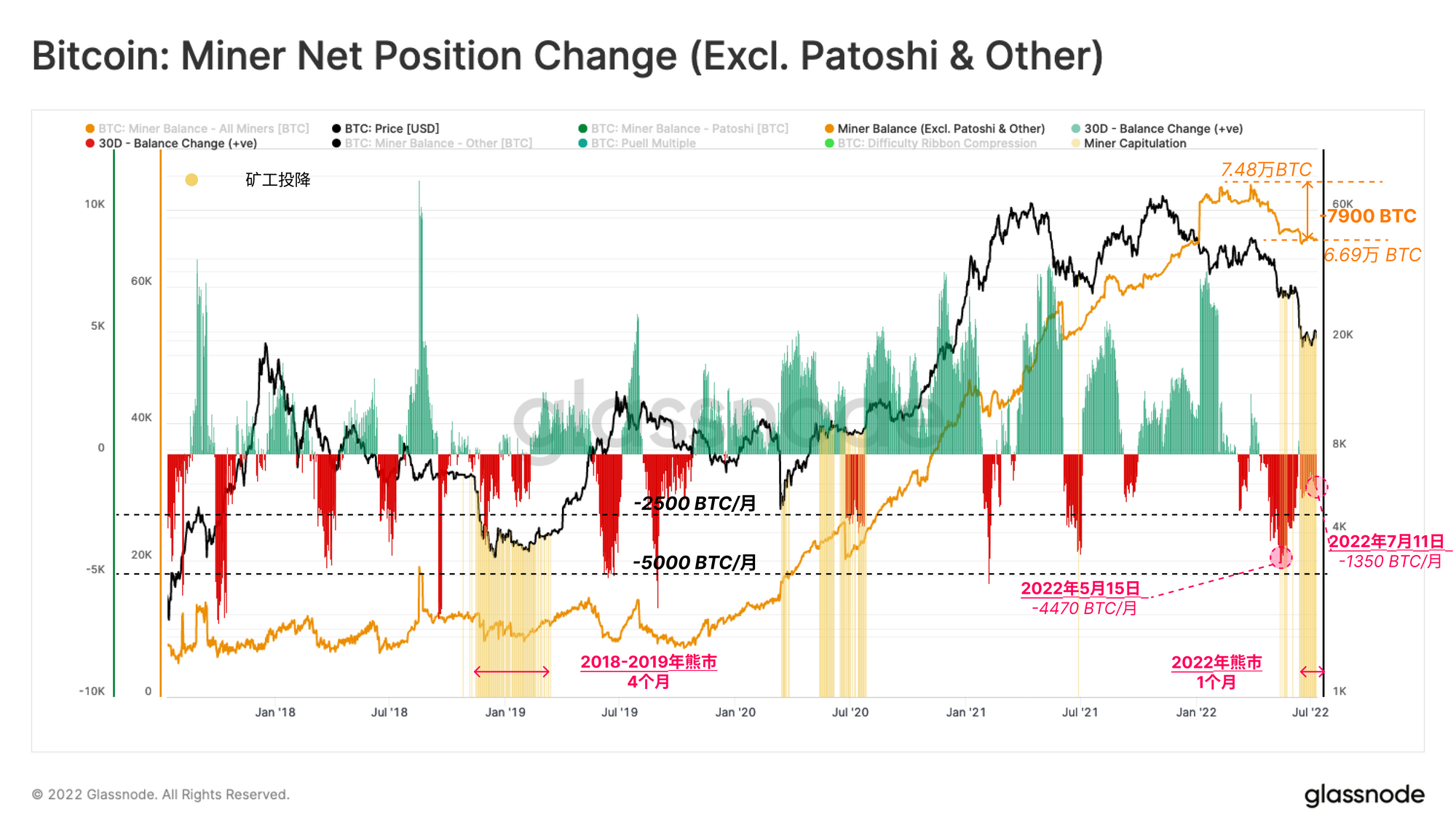 确实存在矿工投降的风险,我们可以确认,最近矿工总余额以每月4470枚比特币的速度减少。主要是在LUNA-UST项目崩盘后开始的。