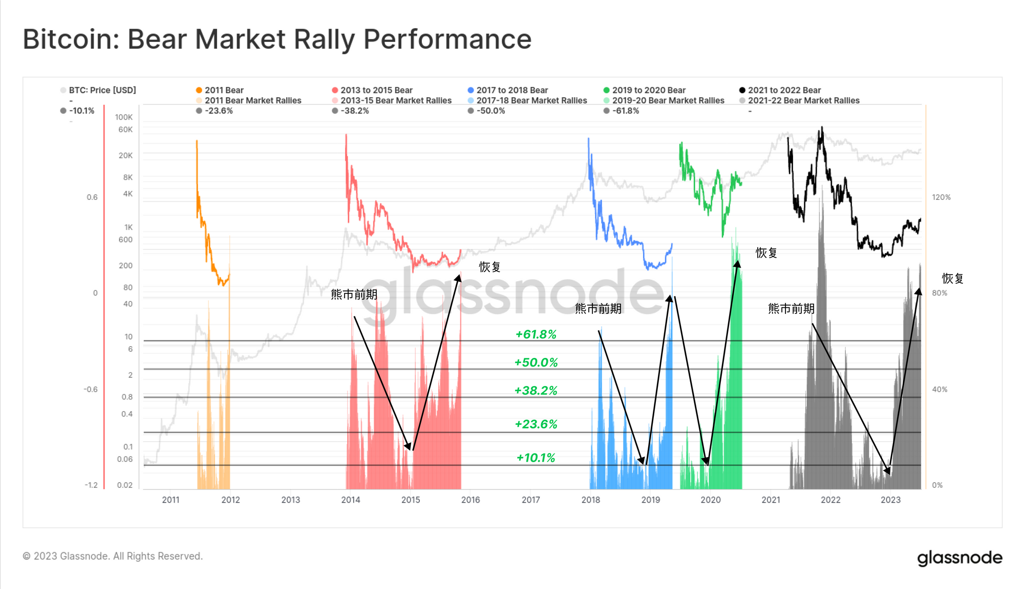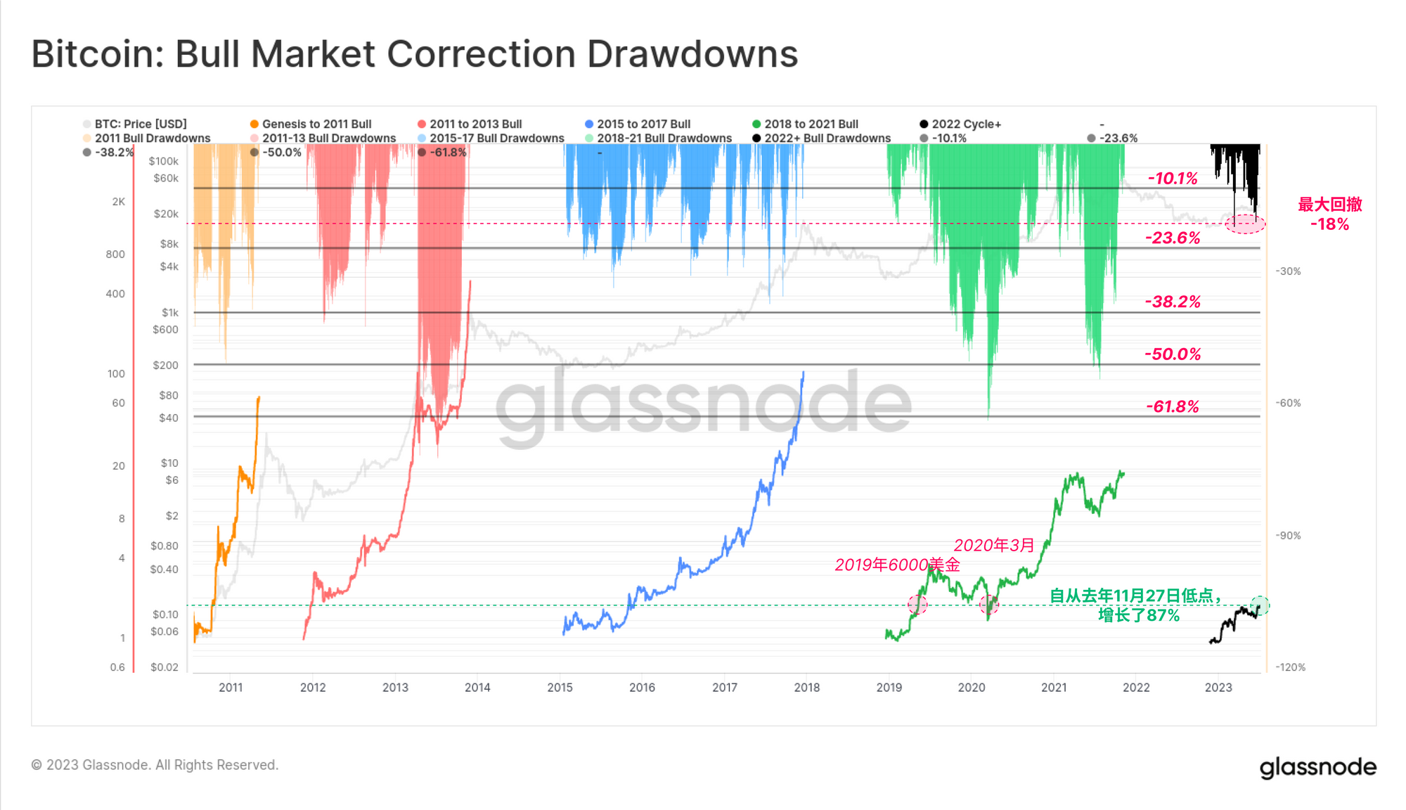 如果我们换上熊市的视角,可以通过周期ATH指数来评估2023年的表现。从这个角度看,从11月低点开始的强劲反弹已经实现了91%的上涨,与之前周期的反弹有极其相似之处。