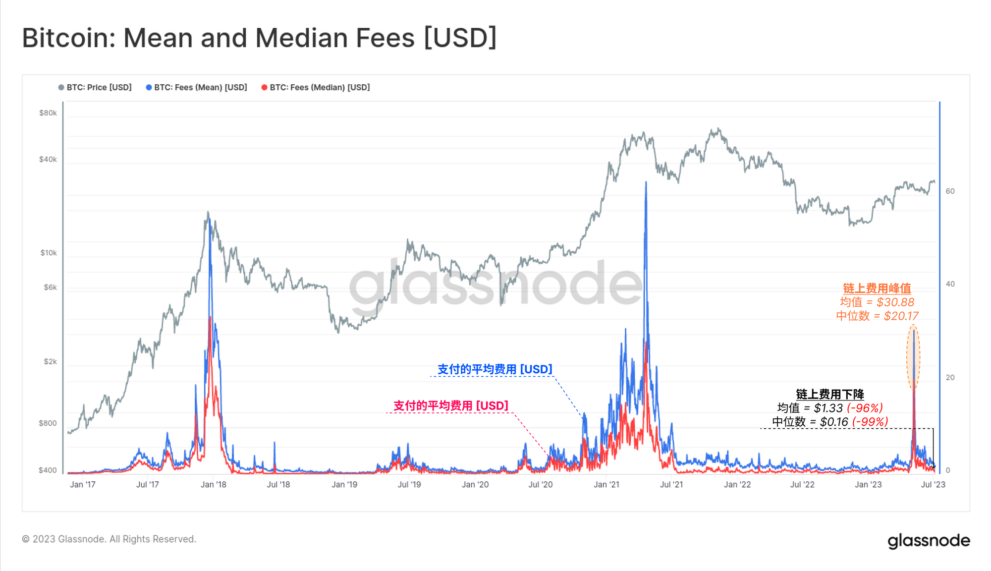 经过几个月的网络拥堵,mempools正在慢慢但肯定地开始清空,链上交易费用也开始下滑。自从5月份BRC-20热度达到顶峰以来,比特币的交易费用(以美元计)已经下降了96%以上,目前的平均费用为1.33美元,中位数费用降低到0.16美元。