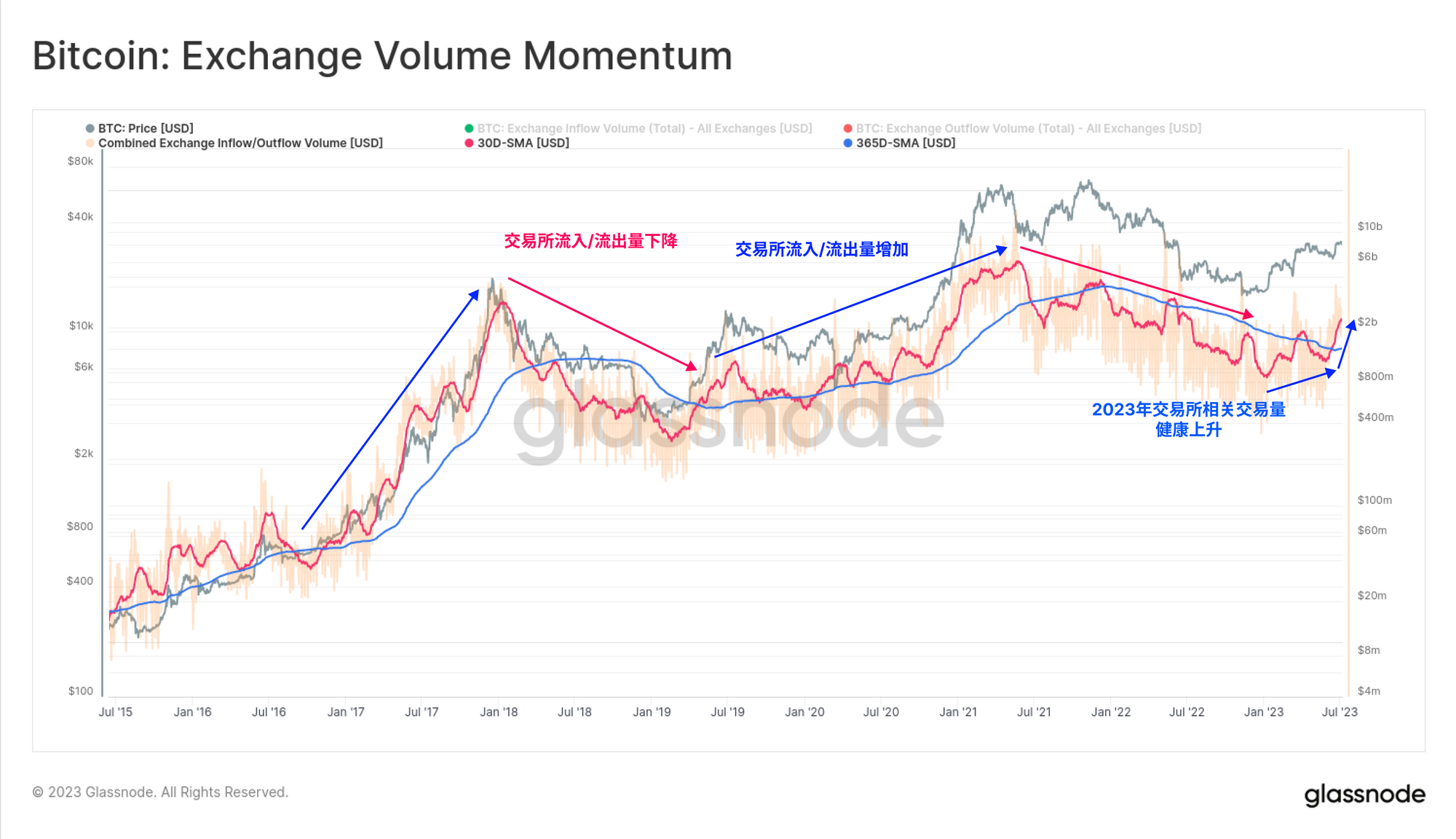 如果我们只关注交易所的流入和流出,我们可以看到比特币网络正在进入一个积极发展的阶段。交易所流量的月平均值现在稳定地超过了年平均值,这意味着从货币资产的角度看,历史采用率正在增加。