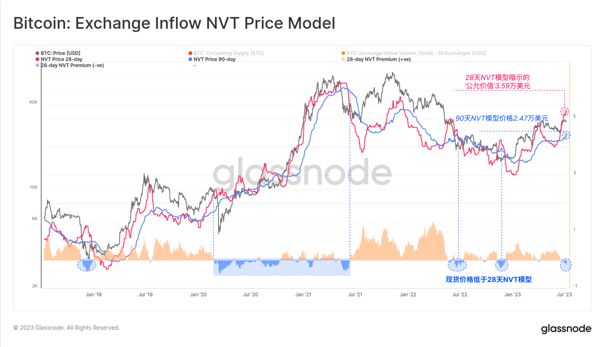 从与交易所相关的活动中,我们可以构建一个NVT价格模型。这个模型旨在为特定数量的链上交易结算量暗示一个“公平价值”。
