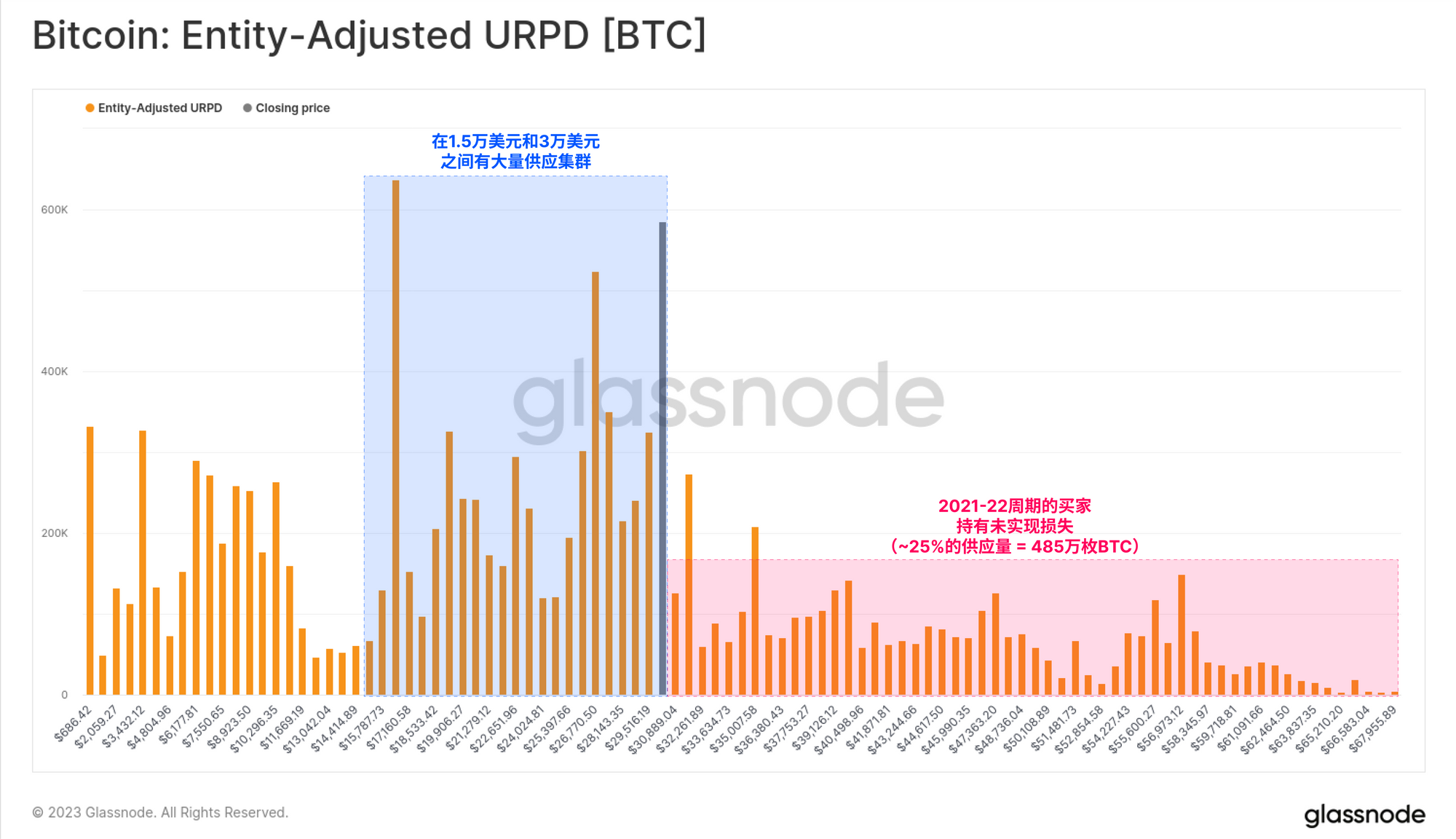 我们可以看到,价格在1.5万到3万美元之间的供应集群相当大,表明在过去12个月里有大量的比特币转手。相比之下,只有25%的供应是以超过3万美元的价格获得的,被2021-22年周期的买家持有。