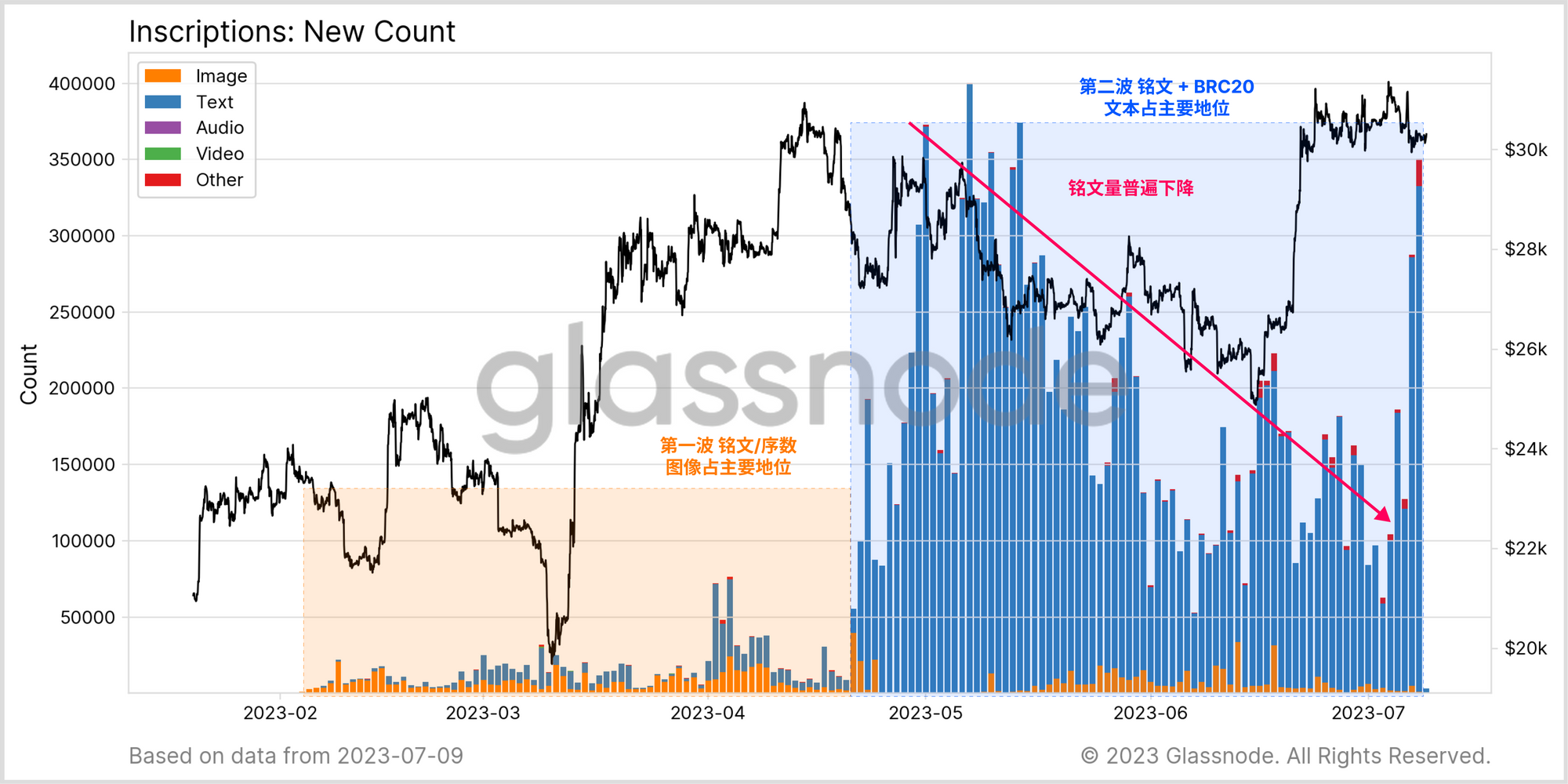 • 第二波:主要与"BRC-20代币"相关的大量付费文字铭文。总体而言,比特币目前拥有1,480万个基于文本的铭文。