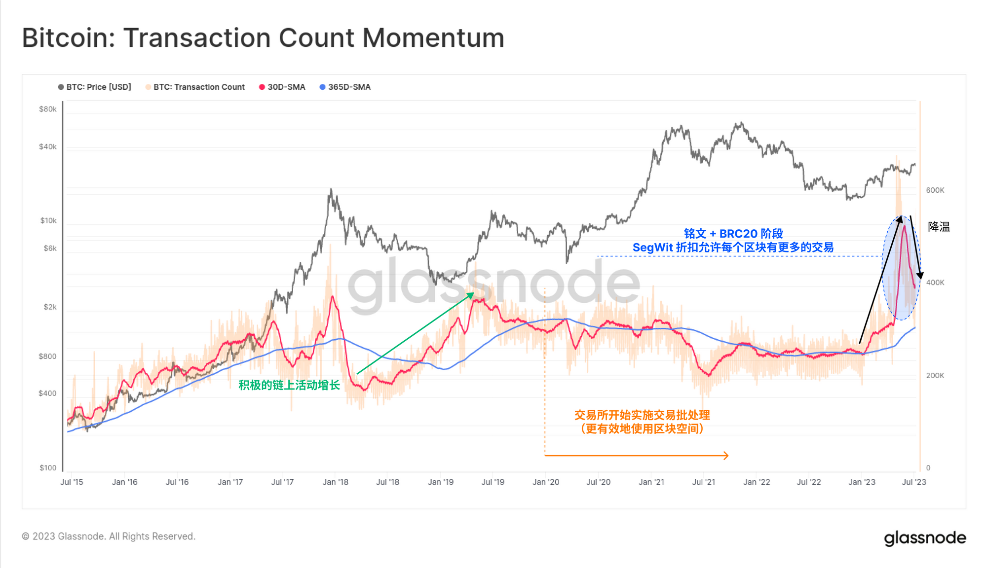 然而,比特币的价格表现相对强劲,今年至今最大跌幅仅为-18%。比特币的链上交易在一定程度上有所降温,这主要是由于铭文活动的减少。然而,货币转移量开始回升,显示出与流动性和采用率增长的积极势头。