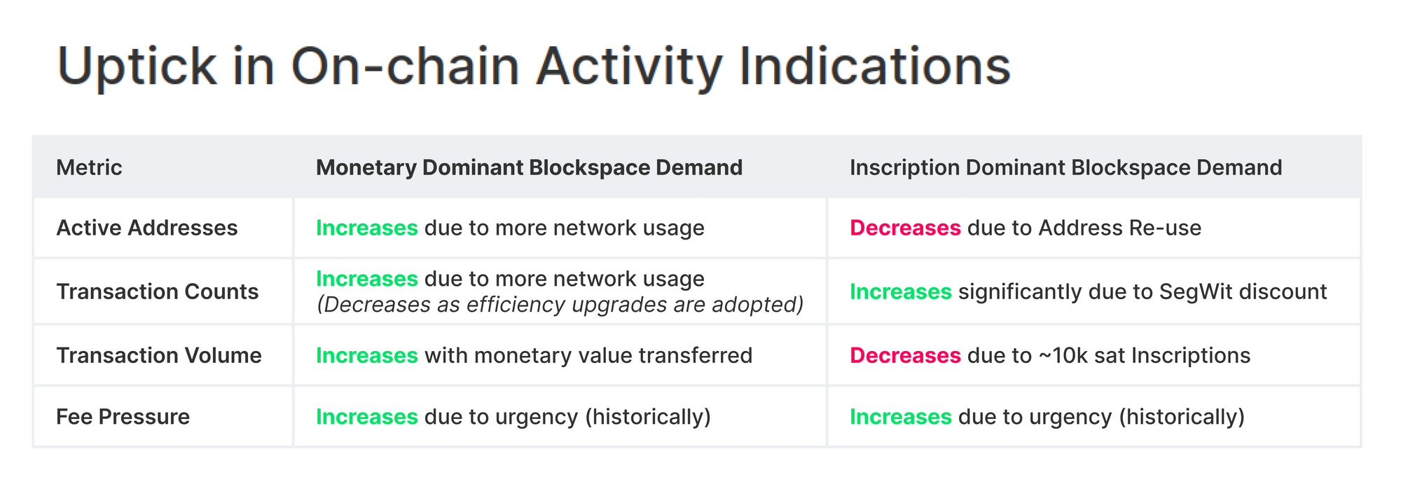 铭文也让我们对链上活动指标的解读框架产生了一种非常有趣的变化。通常来说,比特币链上活动指标的提升被视为采用率增长和网络健康的信号(即,提升通常被看作是好现象)。