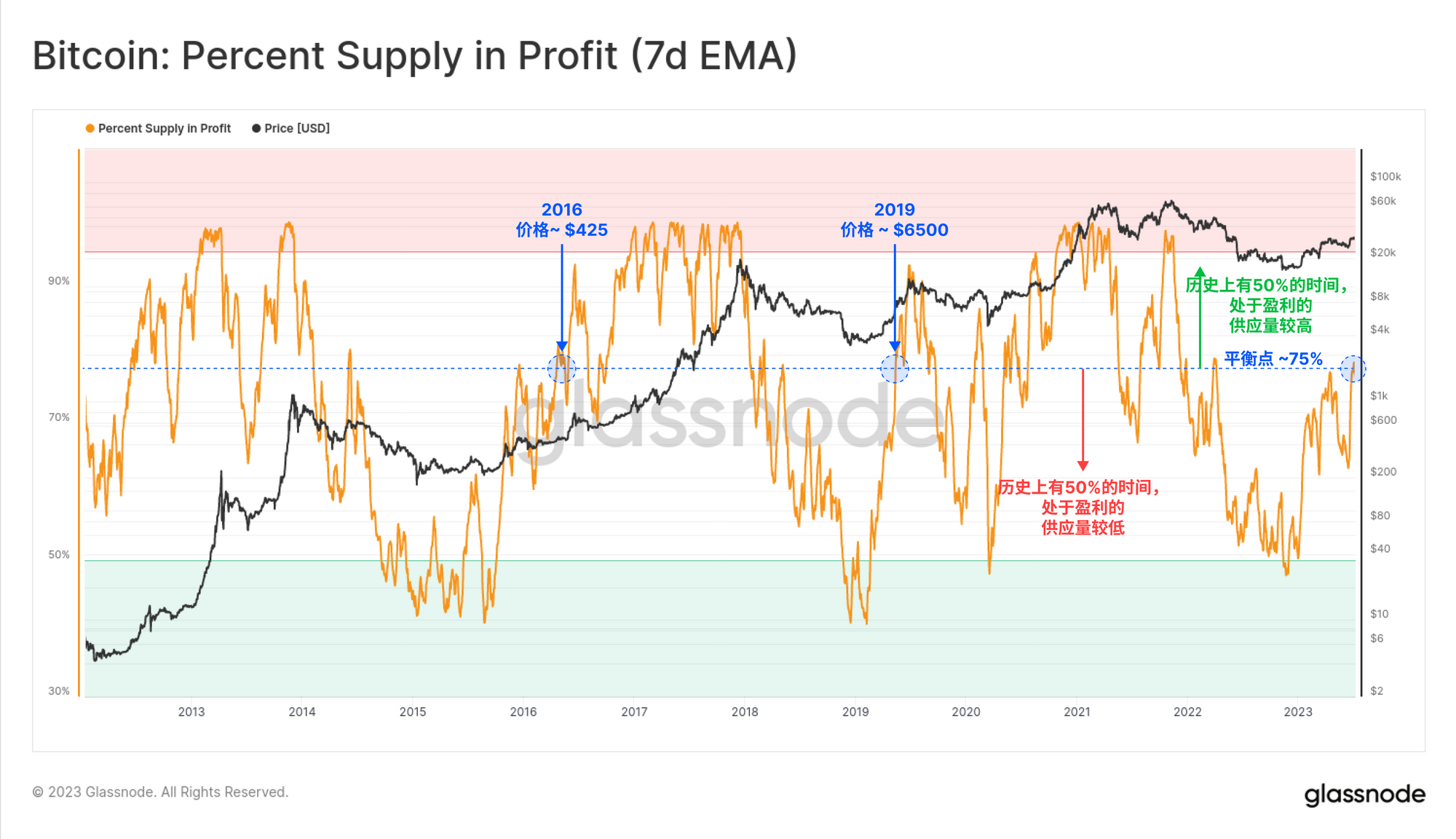 我们在2013-16年的425美元附近和2018-19年的约6500美元处看到了类似的现象。值得注意的是,我们之前提到这些价格水平时,都处在类似的供应量“亏损”的点位。