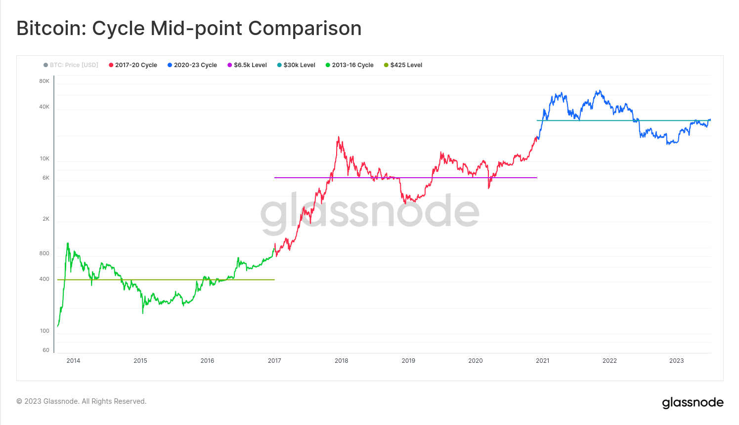 至今,比特币市场仍保持着2023年的大部分涨势,并在最近几周反弹至31000美元以上。随着市场在年内高点附近的震荡,我们可以从牛市和熊市的角度来比较当前价格表现和历史周期。