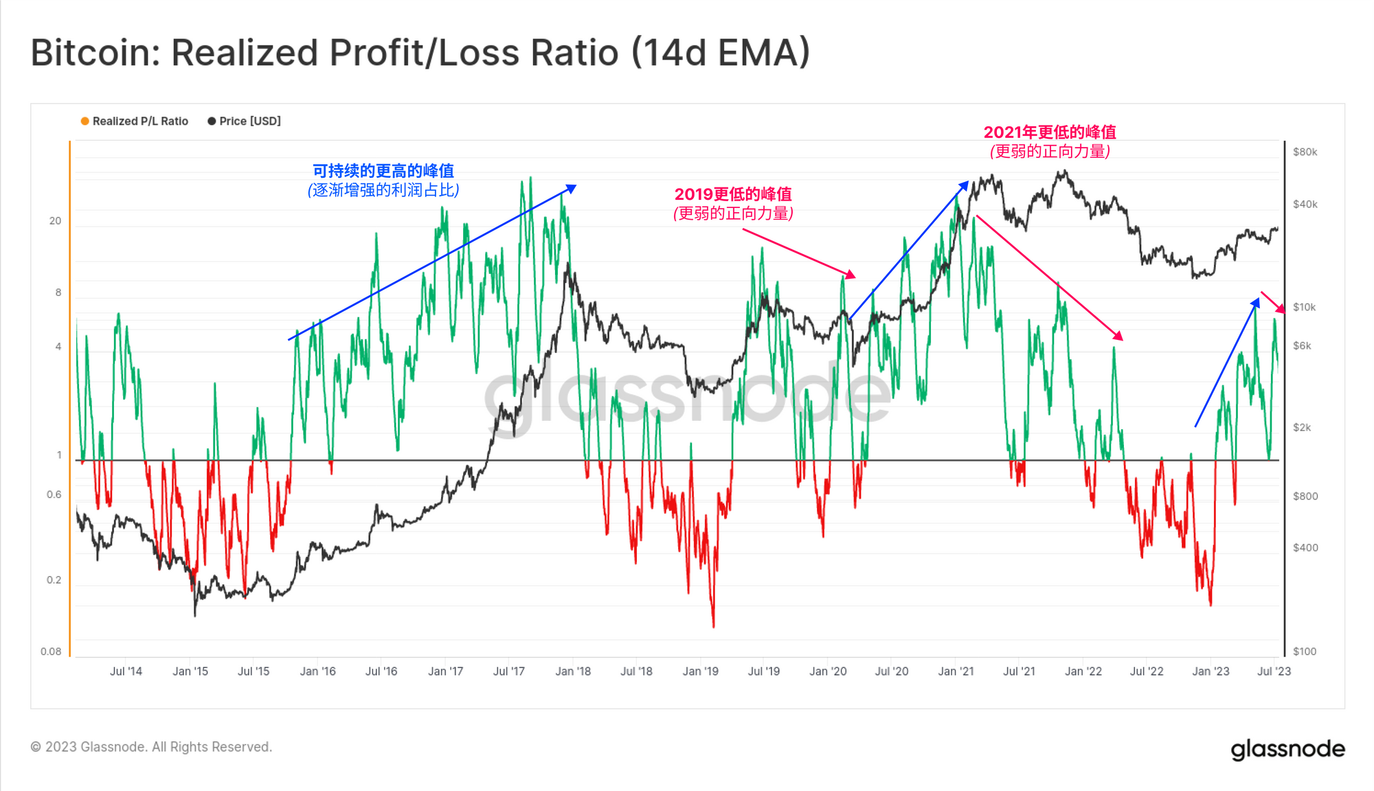 如果我们以已实现总利润与亏损之间的比例来衡量,会发现到目前为止,2023年呈现出的是一种爆炸性的积极态势,在1月初时已经突破了1.0的盈亏平衡水平。
