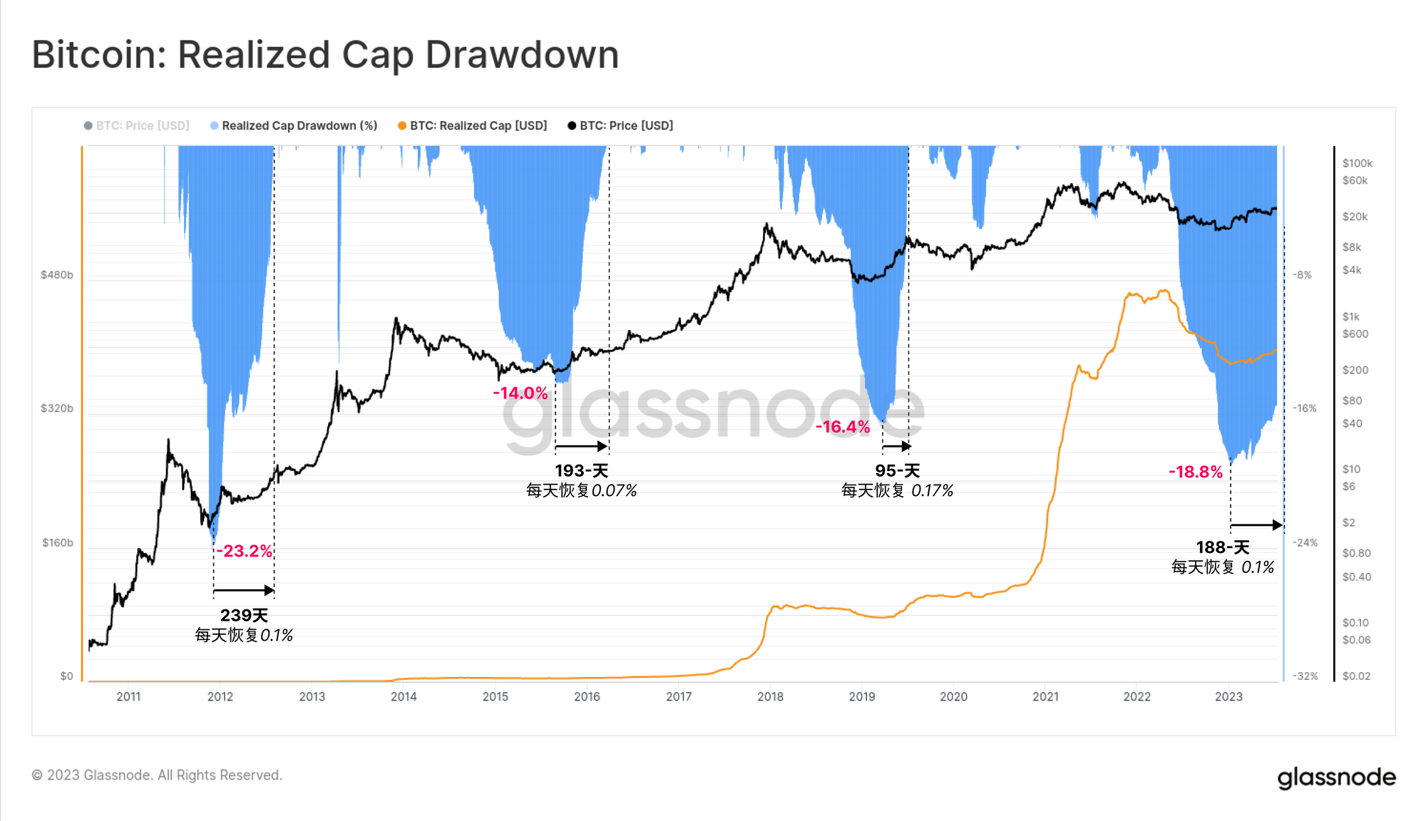 在熊市中,比特币通常会经历大量的资金流出,因为投资者会锁定他们的亏损。2022年实现市值的缩水达到了第二深值,为-18.8%,体现了熊市的严峻形势。在之前的周期中,实现市值的最高点(ATH)需要95至239天来恢复,目前的恢复速度与此相似。