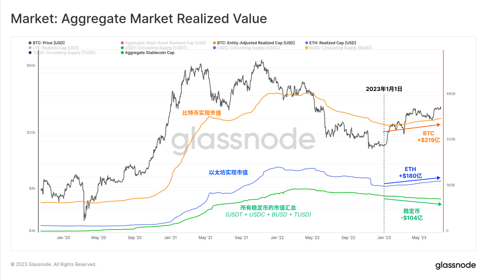 我们还可以通过比较比特币和以太坊的实际市值以及顶级稳定币的供应量来衡量数字资产市场的更广泛变化。根据这个标准,我们可以看到大部分资金是通过比特币和ETH这两个主要币种流入的,这两个币种今年的流入量分别为219亿美元和180亿美元。