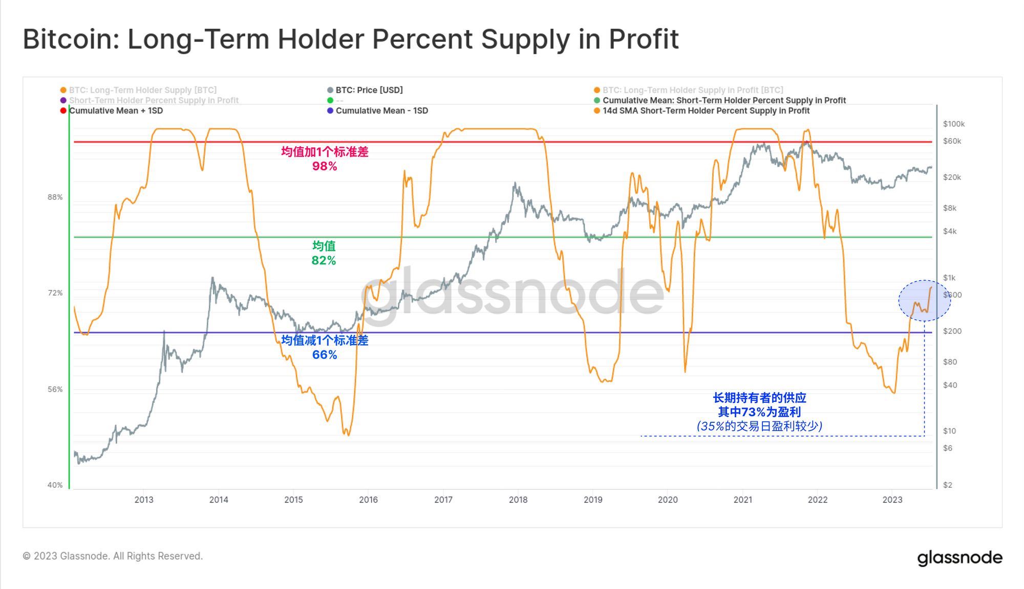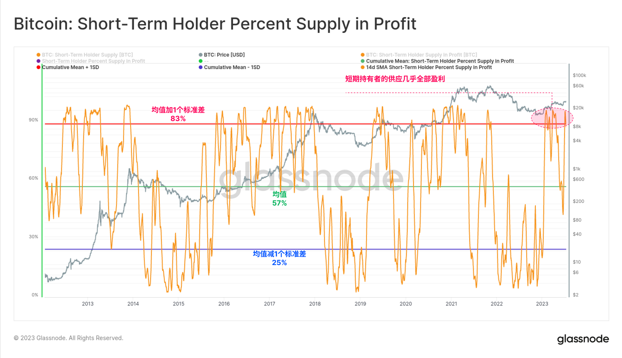 当我们考虑到STH供应中获利持有的比例(目前略高于其总余额的88%)时,就会明白这一点。这个比例远高于平均值加上一个标准差的水平,历史数据显示,这通常与整体的上涨趋势相关,在这种趋势下,人们的利润动力很大。