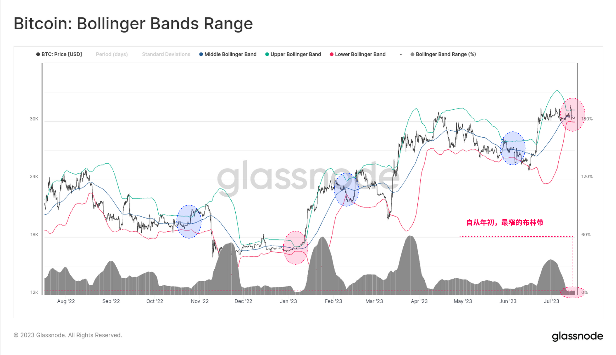 布林带上下轨之间的价格区间仅为4.2%,这是自今年1月份市场清淡以来比特币市场最为平静的时期。
