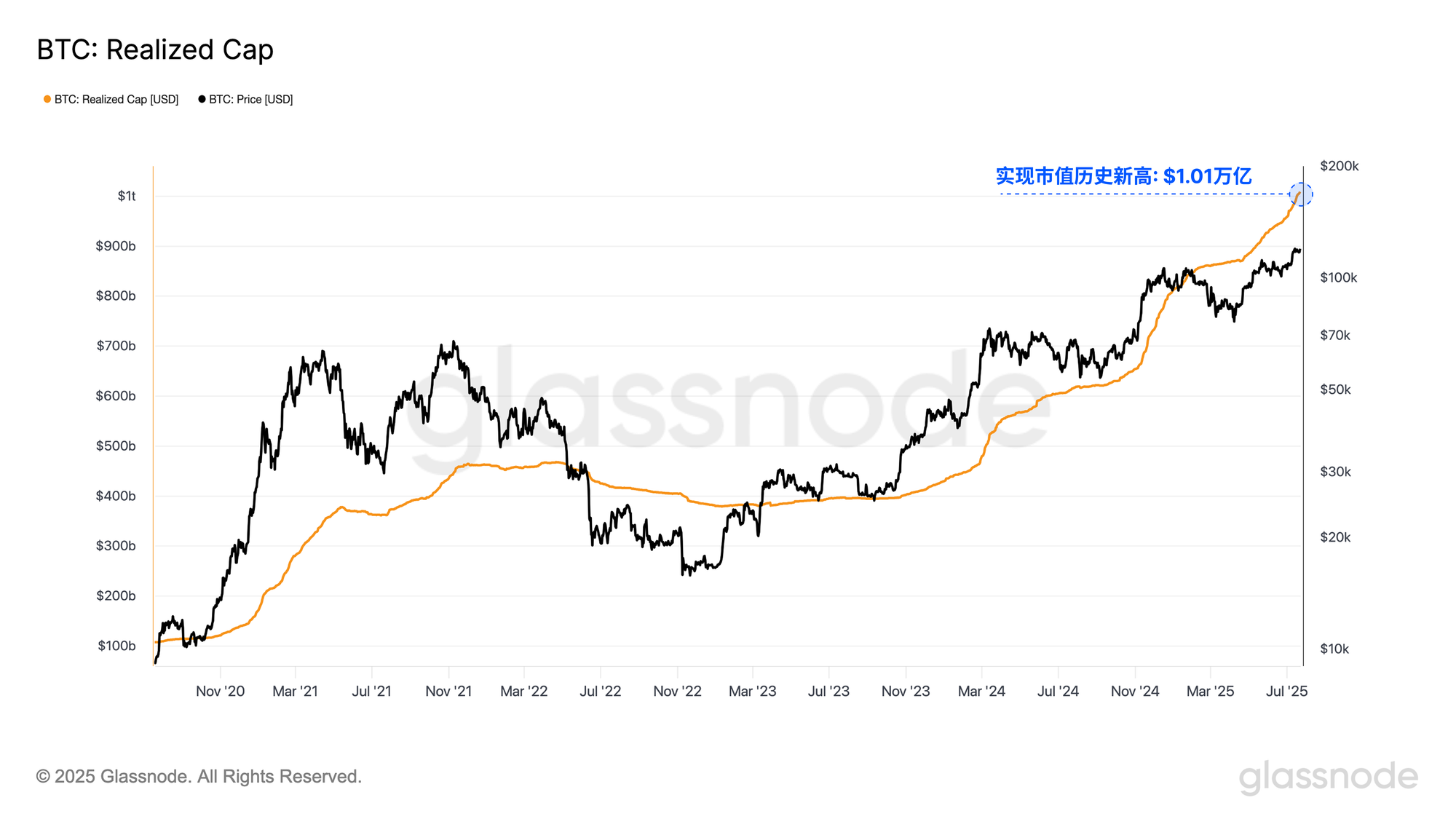 - 比特币的实现市值首次达到1万亿美元。这是比特币真正具有里程碑意义的时刻,突显其深度流动性特征以及在宏观层面日益增长的重要性。