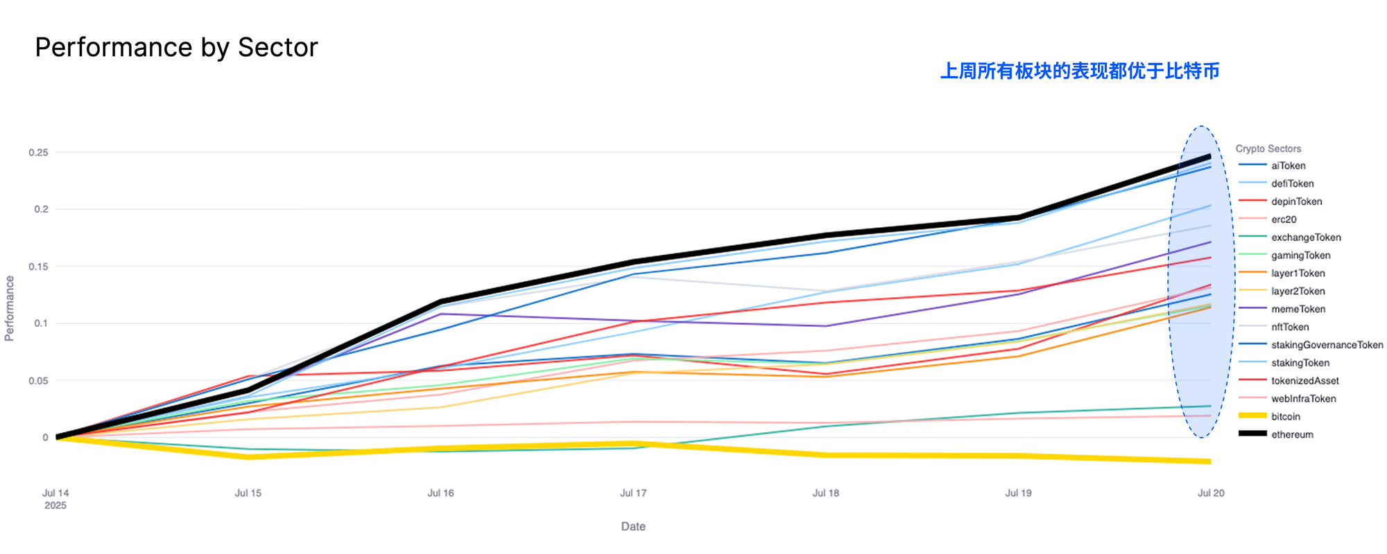 我们可以通过分析过去一周数字资产生态系统中各个板块的表现,来验证这一观察结果。比特币近期的盘整十分明显,价格走势在过去一周基本保持平稳。相比之下,所有其他数字资产板块目前表现优于比特币,尤以以太坊为代表。这种机制是沿风险曲线进行资本轮动的经典范例。