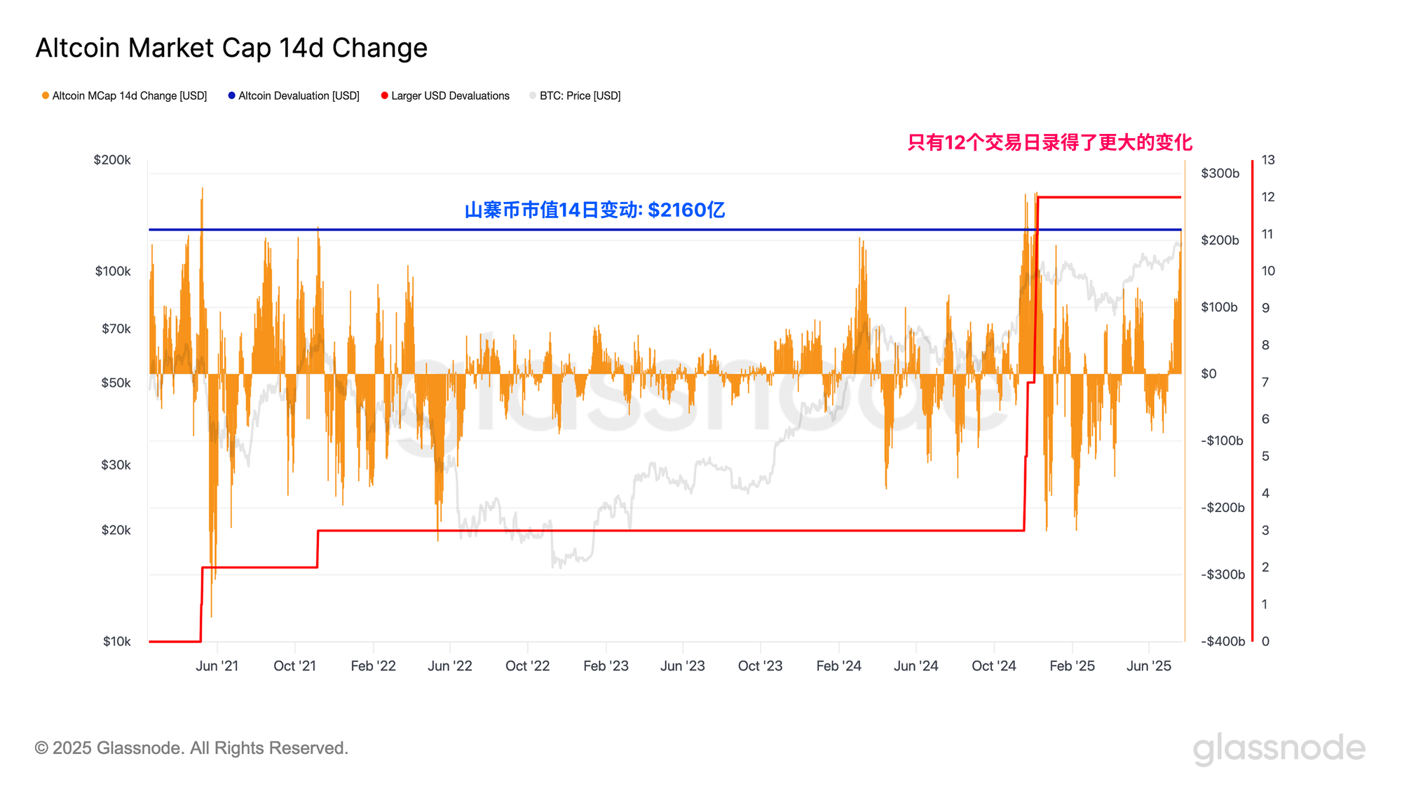 过去两周,山寨币市值的变化幅度非常显著,山寨币市值累计增长了2160亿美元。这是以美元计的山寨币市场总市值最大涨幅之一,进一步印证了当前山寨币季行情的动力。