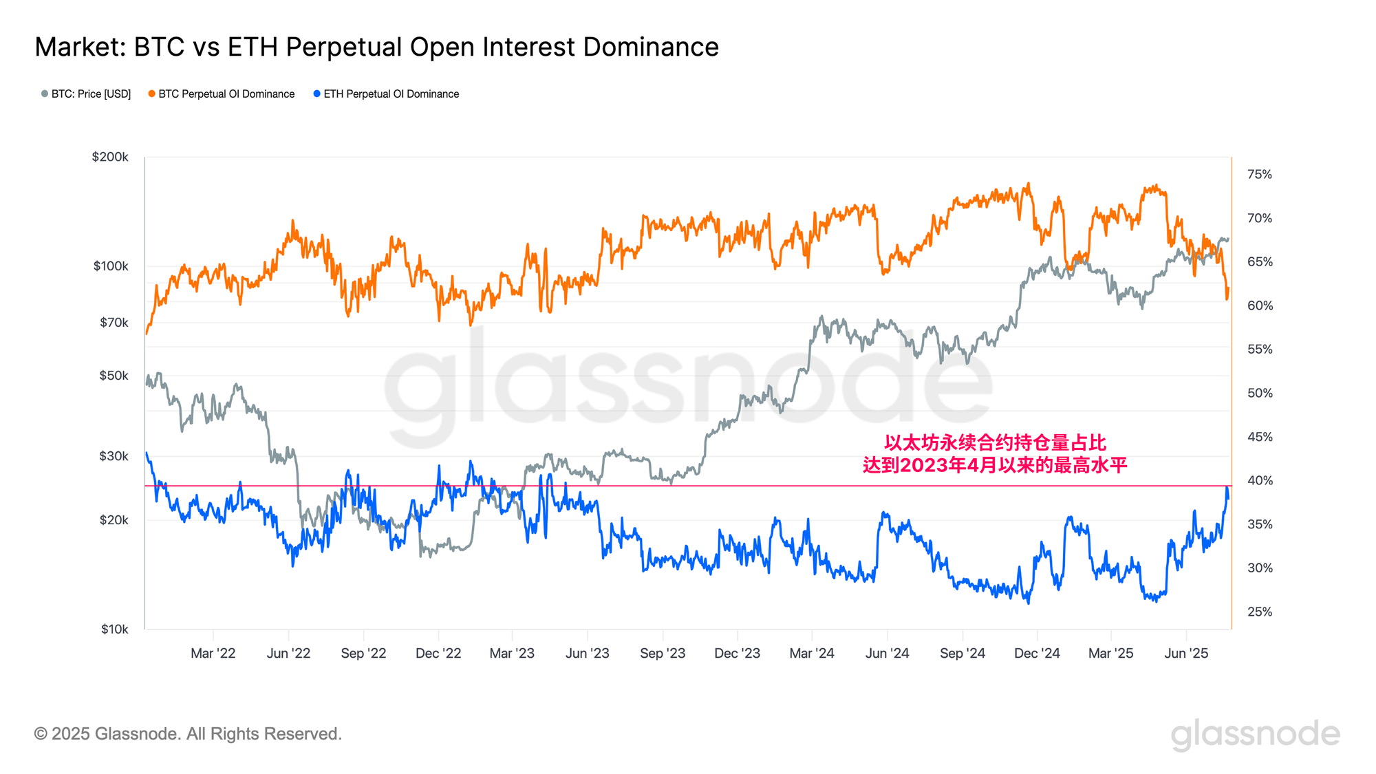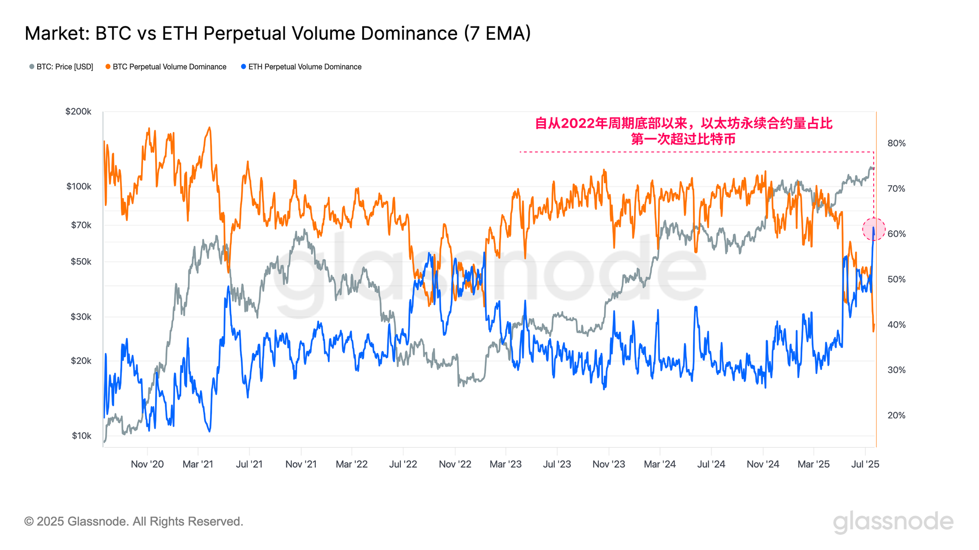 在本轮周期中,山寨币板块整体表现不佳,而近期的强势反弹标志着投资者行为出现了显著转变。这一变化在永续合约市场中尤为明显,以太坊的永续合约主导地位已升至历史新高,自2022年周期低点以来首次超过比特币。
