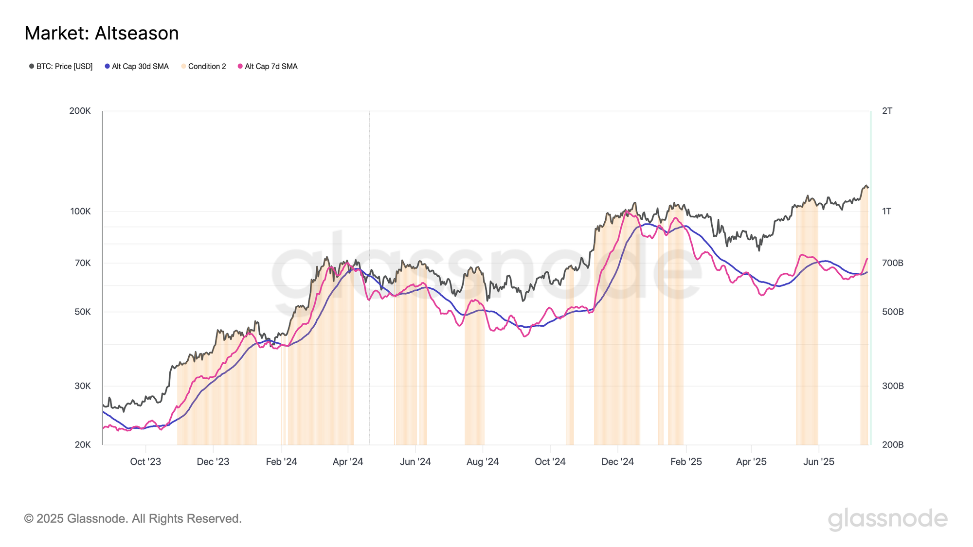 从该模型的视角来看,山寨币季的条件首次出现在7月9日,并自那时起持续存在,表明资本正在整个加密市场中重新分配。