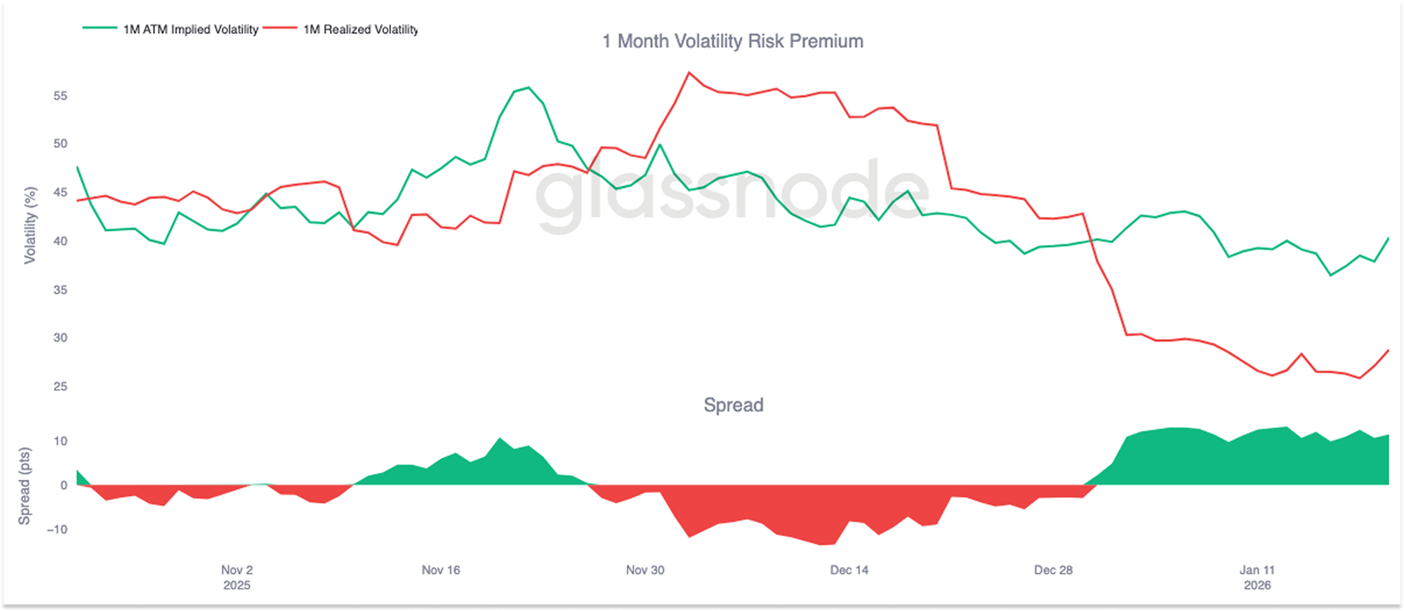 这一动态进一步强化了波动率压缩。只要卖出波动率仍然具有盈利性,就会有更多参与者愿意介入,从而使隐含波动率保持锚定。截至1月20日,一个月期波动率价差约为11.5个波动率点,有利于卖方,凸显当前环境对波动率卖出行为的支持力度仍然较强。
