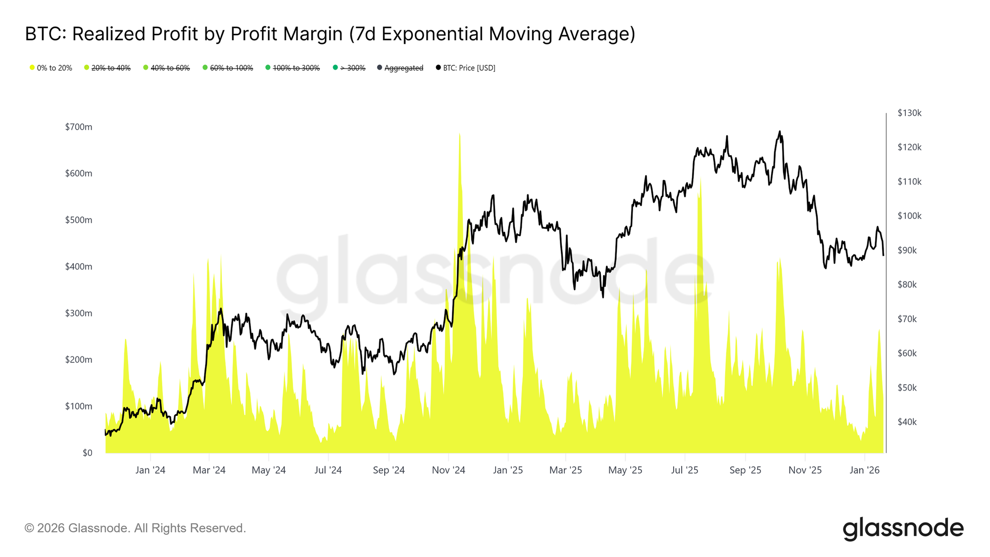 在获利兑现方面,“按利润率划分的已实现利润”指标显示,0%至20%利润率区间的利润占比显著上升。这一变化凸显了盈亏平衡卖方和短期波段交易者的影响力,他们更倾向于以相对有限的收益退出头寸,而不是继续持有以博取趋势延续。