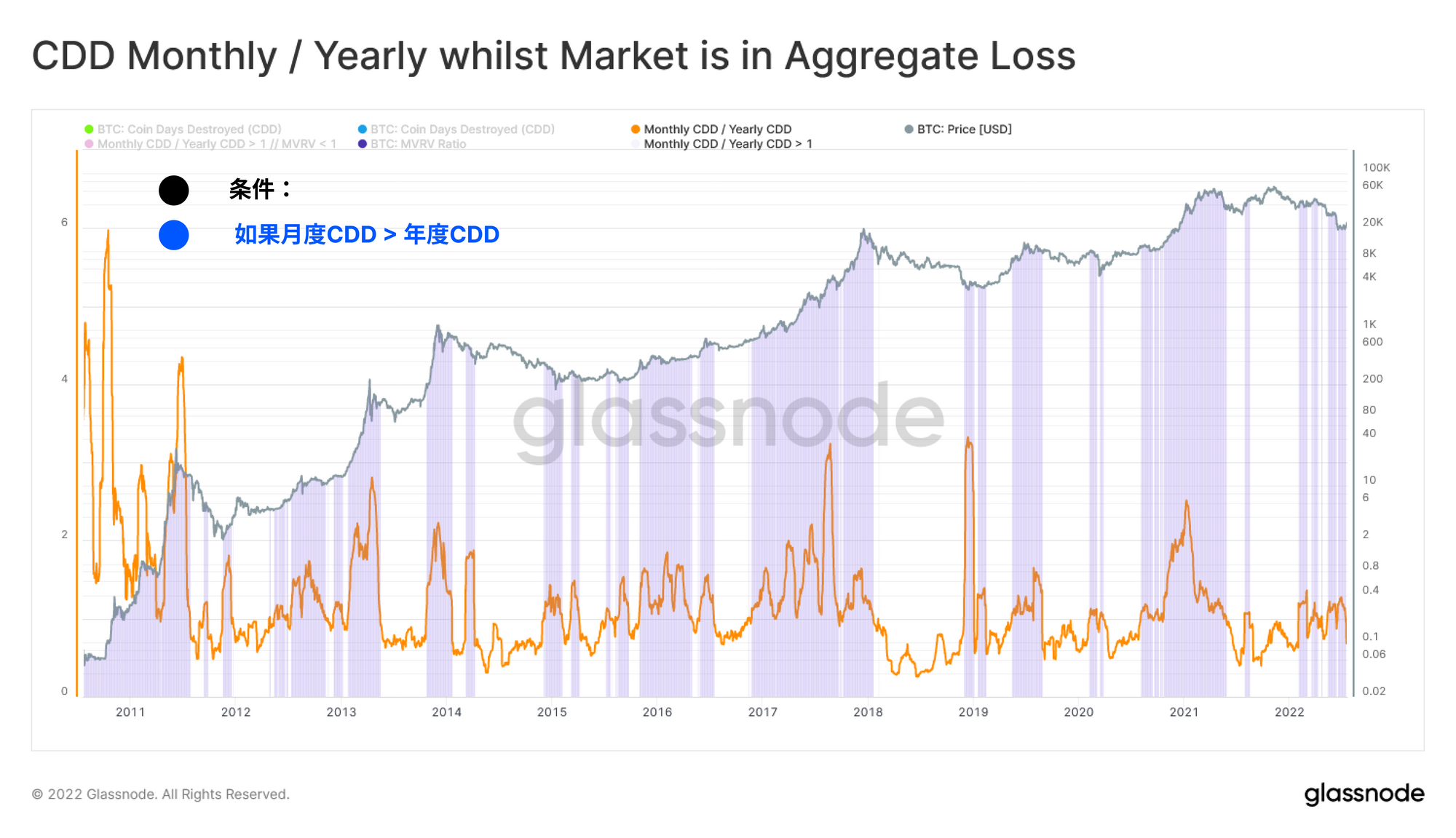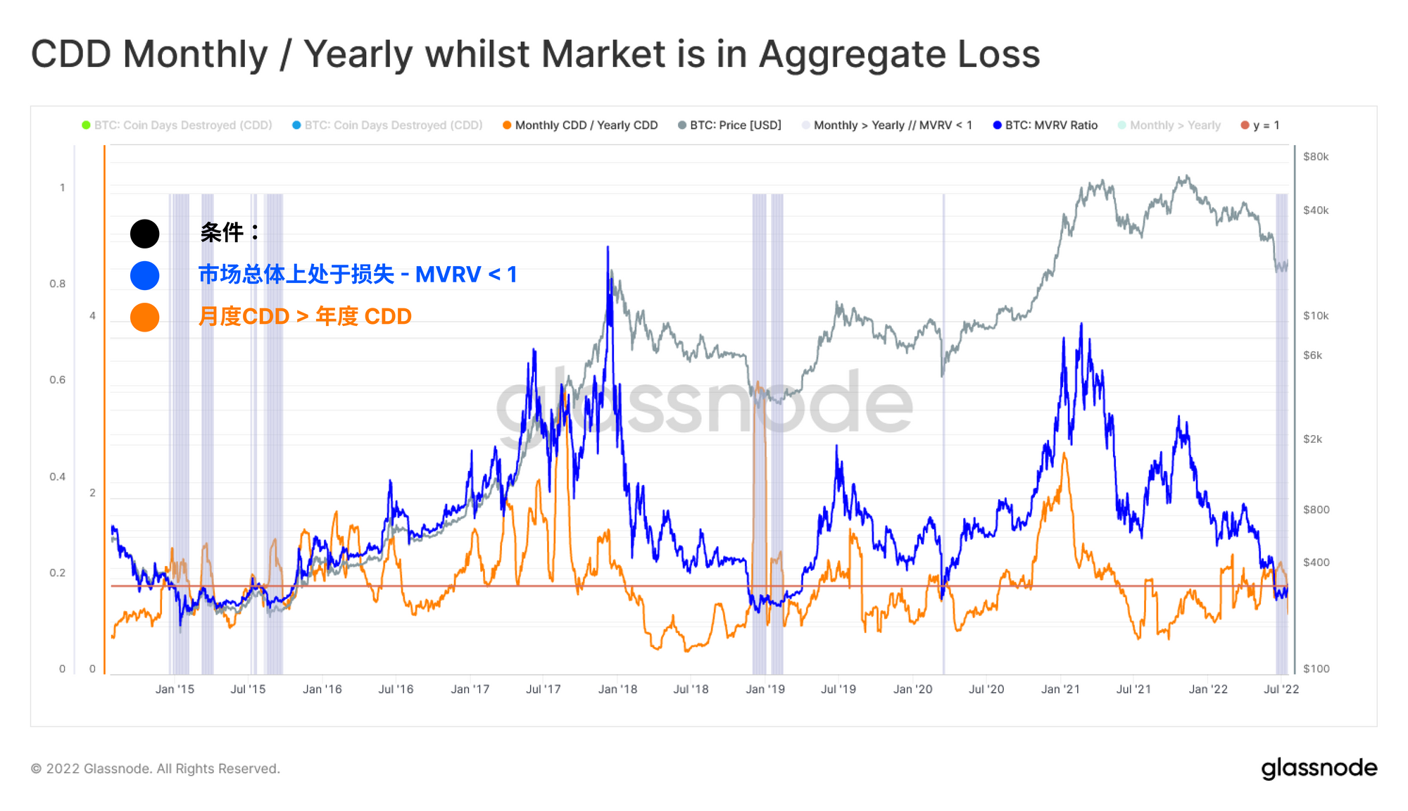 - CDD震荡器数值高于1 ,而市场处于总体亏损状态(MVRV低于1)时,通常与投降期相吻合。