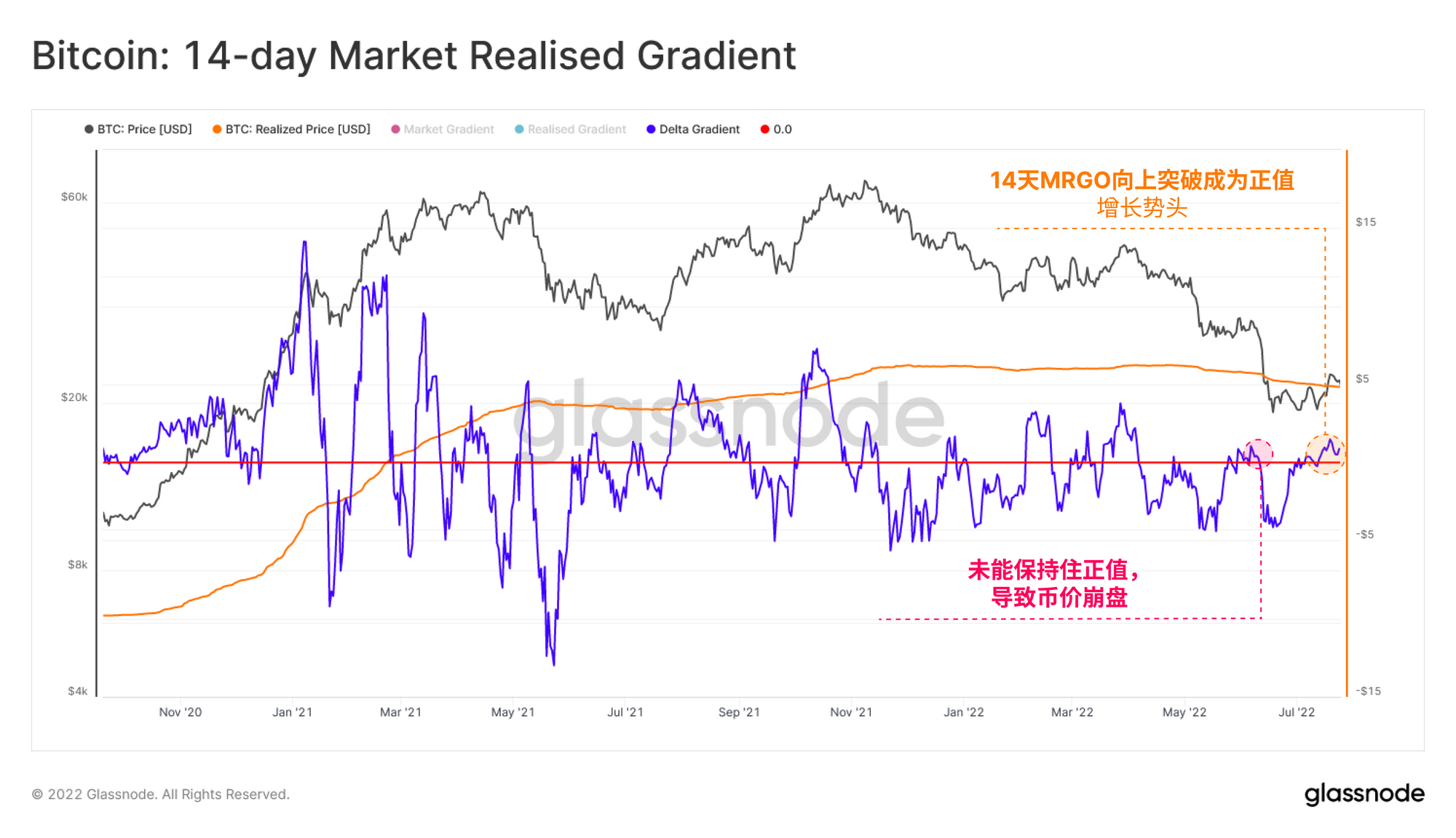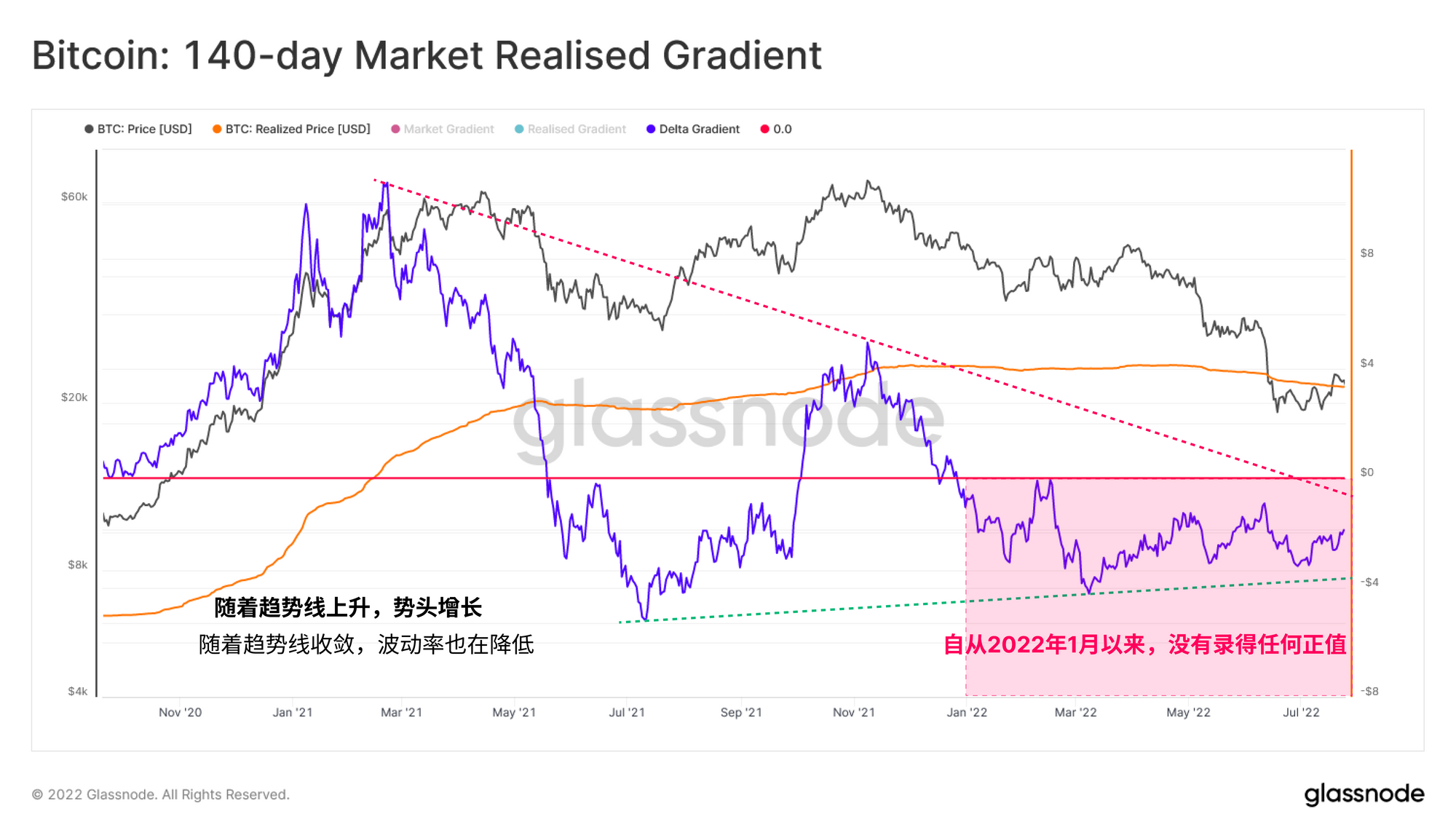 虽然在140天的MRGO的尺度下,2021年5月的抛售仍然是这个周期中最严重的势头转变。然而,正如在 周报:历史级别的熊市中所讨论的,最近在5月(LUNA)和2022年6月的抛售可以说是有记录以来最大的一些抛售。这表明在宏观上,随着时间的推移,市场下行势头的程度正在减弱,这可能预示着卖方的疲惫程度,以及市场稳定即将到来。