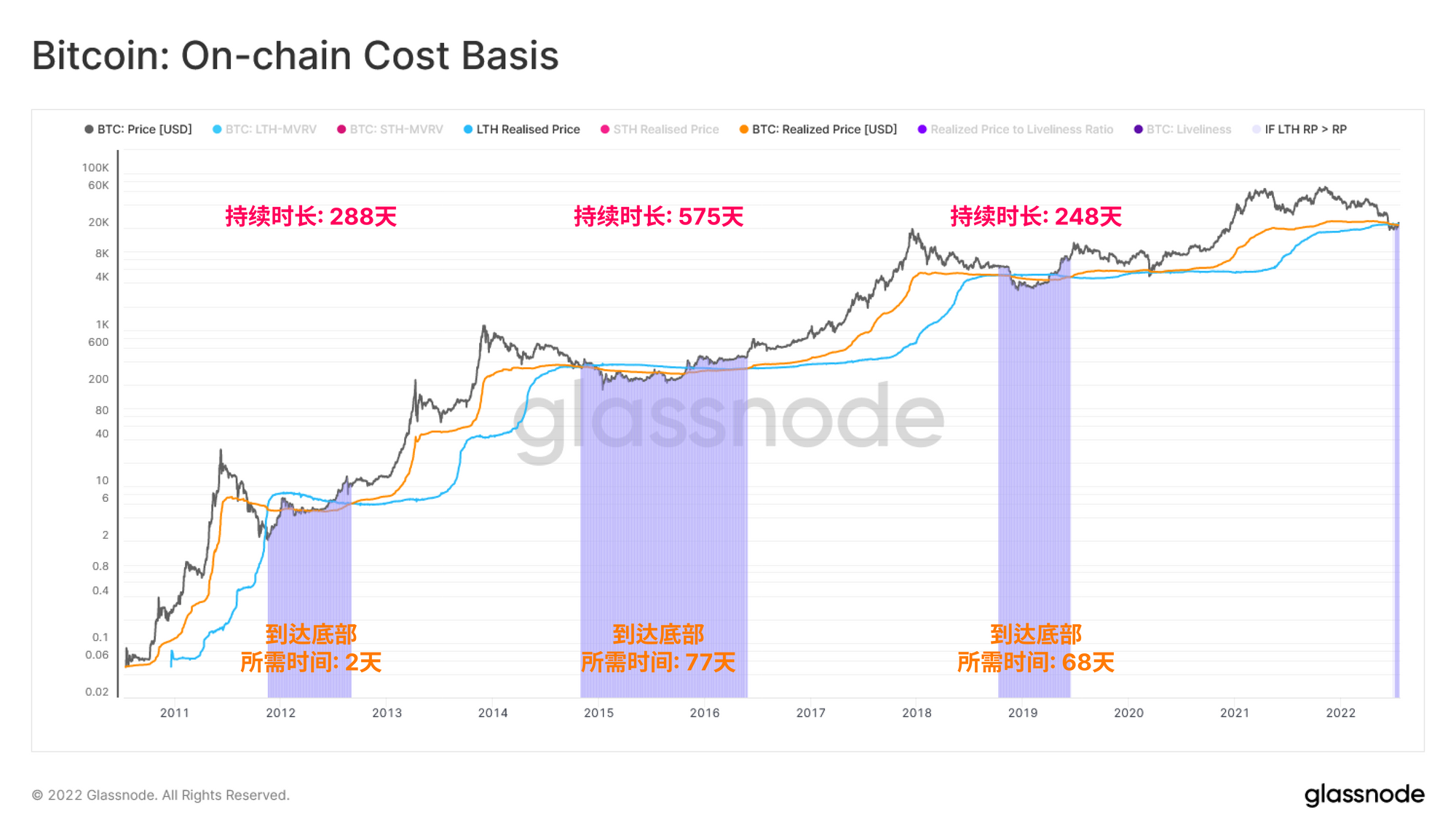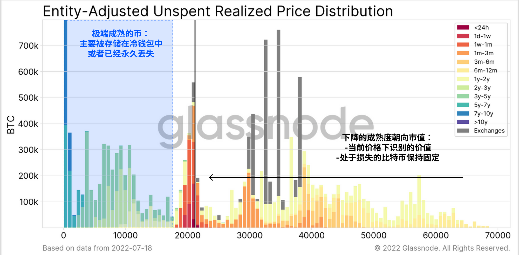 - 可以看到成熟度从历史前高到目前的市场价值都在下降,反映了当时下跌趋势的持续时间。大量比特币是在6个月前积累的,它们的所有人持有大量未实现的损失,似乎不愿意出售。