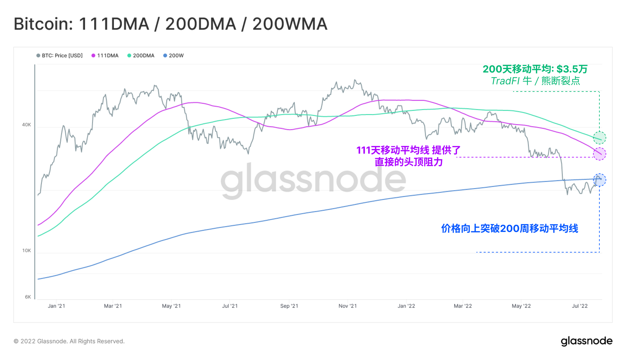 - 200天移动平均线目前在3.5万美元,仍然是宏观牛市和熊市势头之间的关键过渡界限。