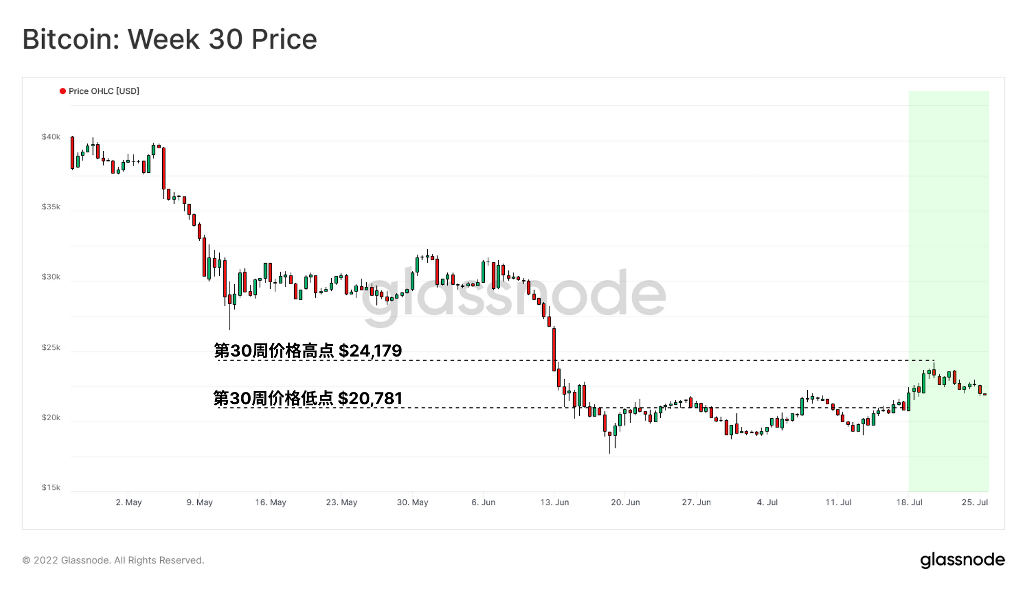 经过一个月的盘整,比特币价格经历了期待已久的解脱性反弹,周末收盘时比开盘价高出9%。比特币在周初以20,781美元开盘,反弹到24.179美元的高峰,然后在周末从高点下降,跌至盘整范围。